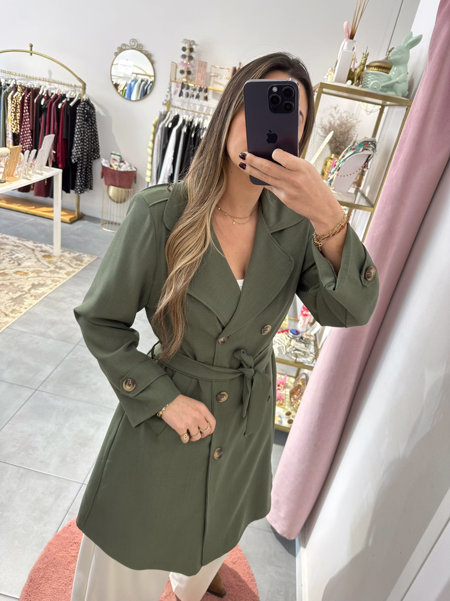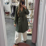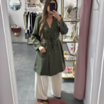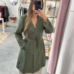 Gabrdine bege oversize com bolsos e cinto.
