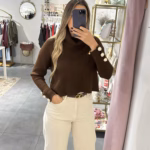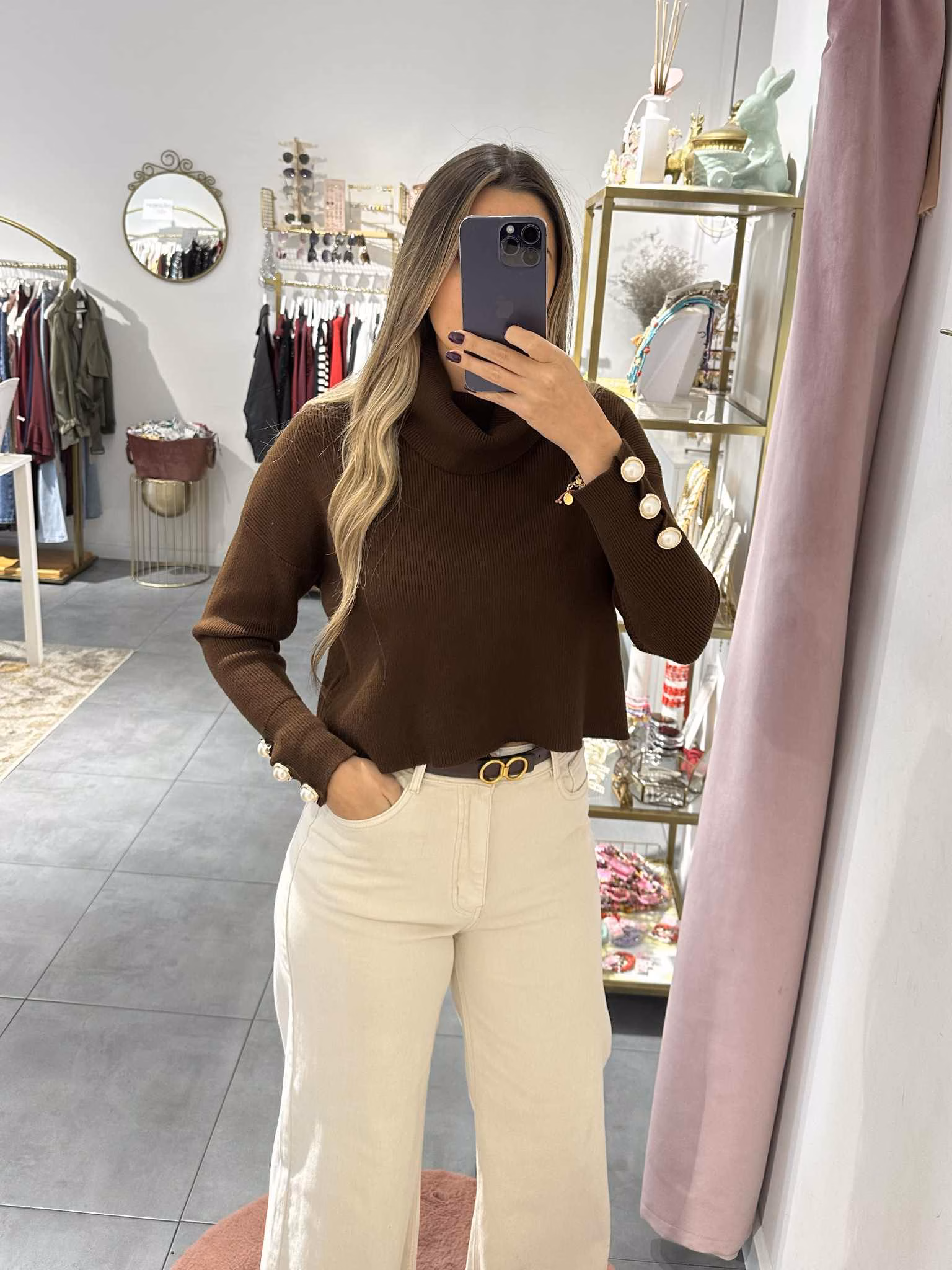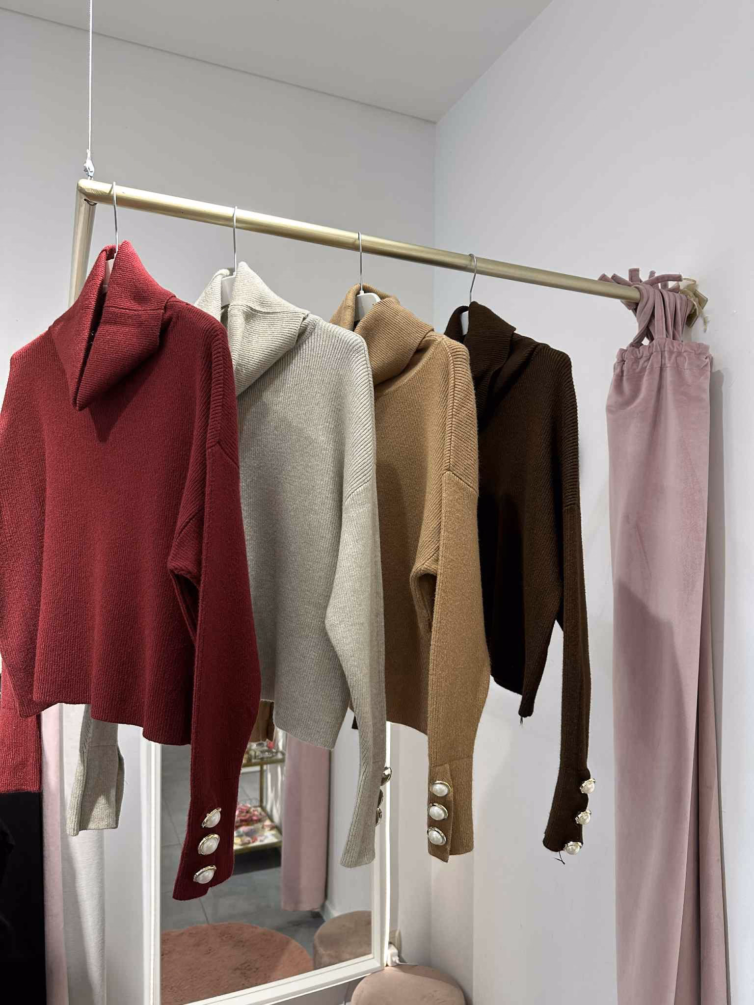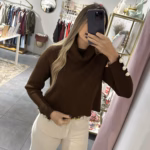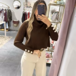 Camisola malha cropped com gola larga e botões em pérolas nas mangas.