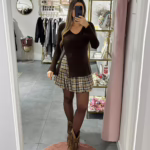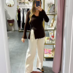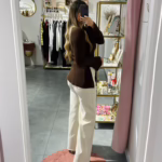 A modelo tem 1,73m e veste o tamanho M/L parte de cima e um 38/40 de parte de baixo.