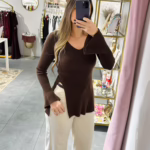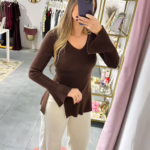 Camisola em malha canelada com decote em V e racha na parte frontal, as managas fazem balão na zona do punho.