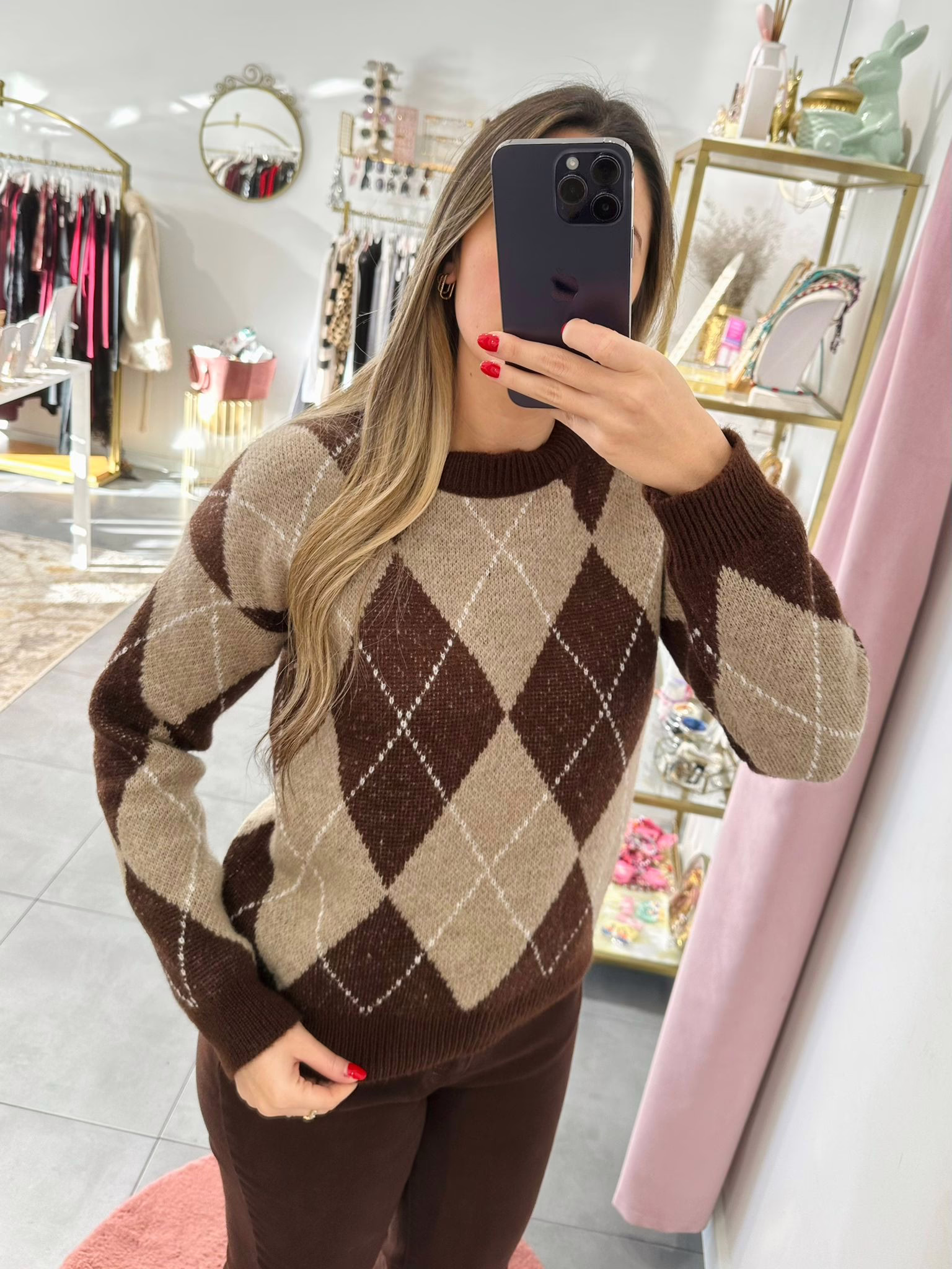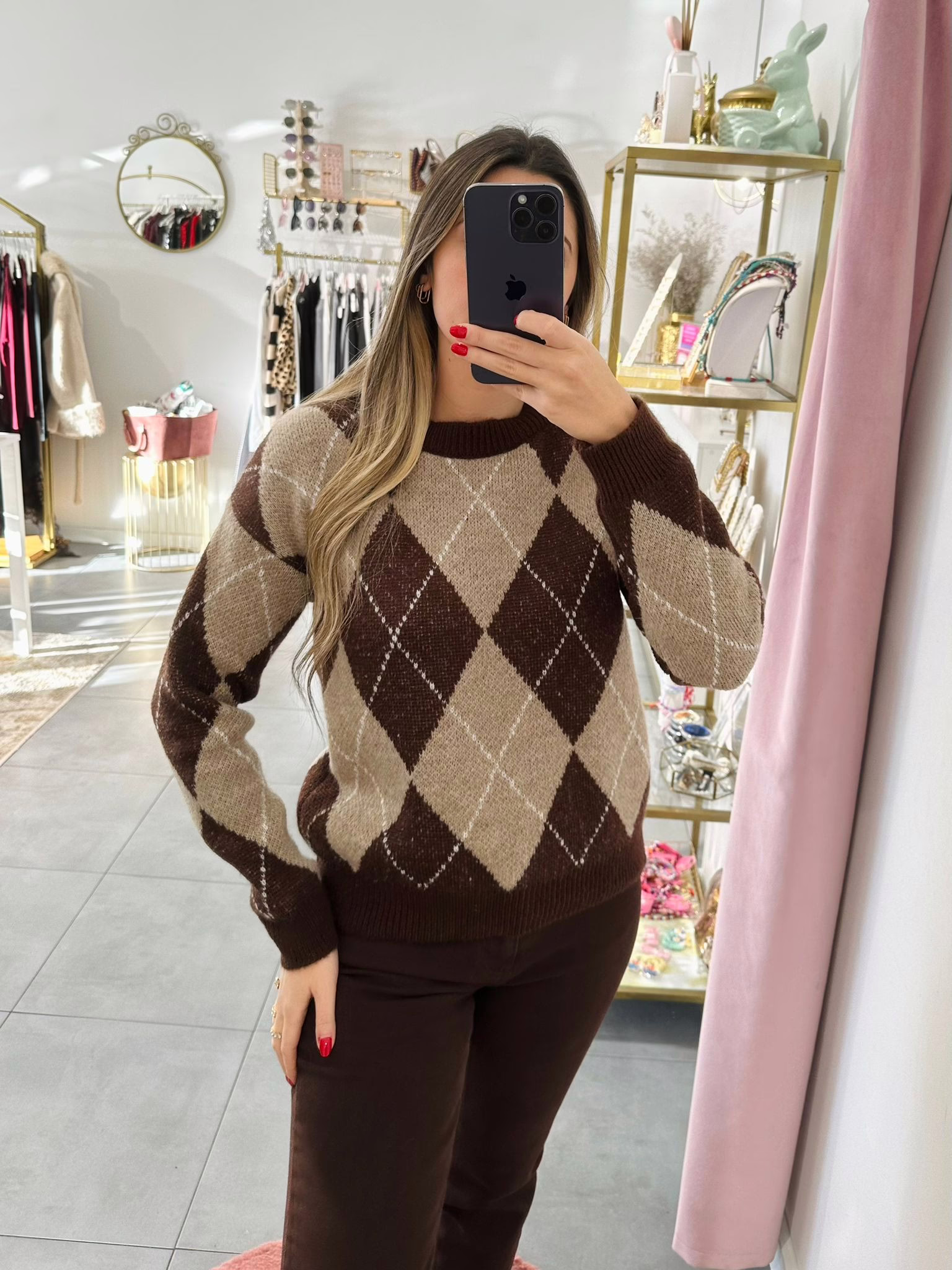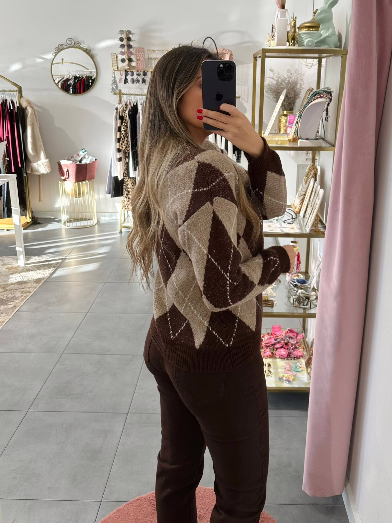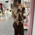 A modelo tem 1,73m e veste o tamanho M/L parte de cima e um 38/40 de parte de baixo.