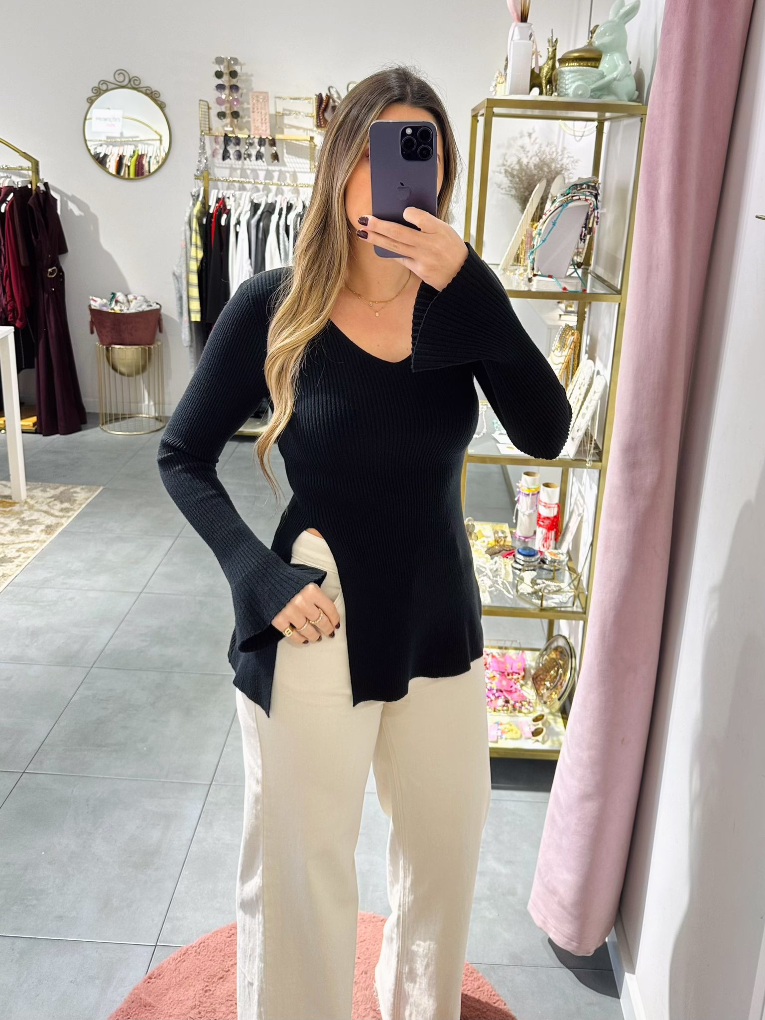 Camisola em malha canelada com decote em V e racha na parte frontal, as managas fazem balão na zona do punho.