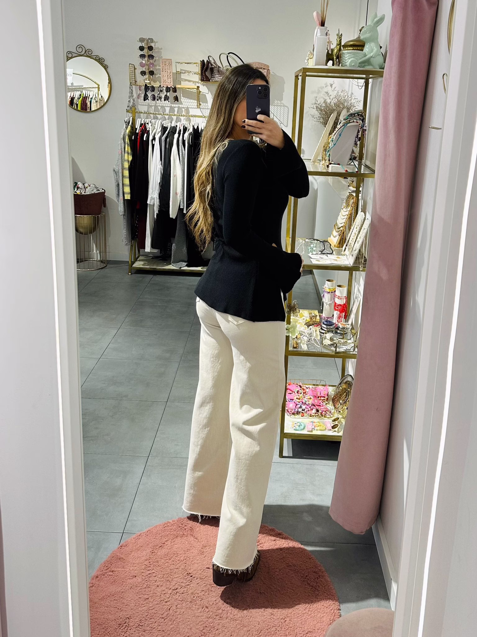 A modelo tem 1,73m e veste o tamanho M/L parte de cima e um 38/40 de parte de baixo.