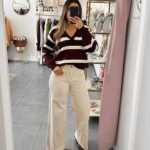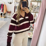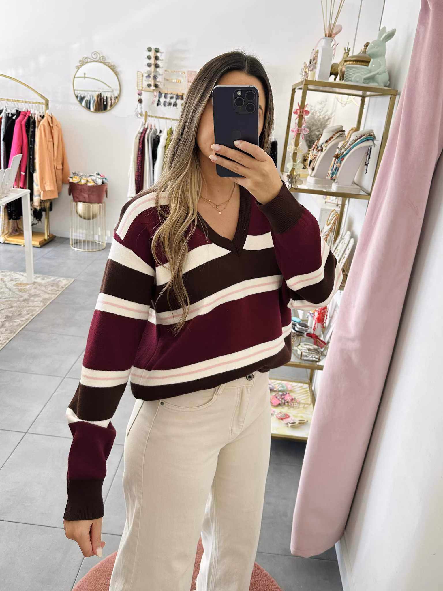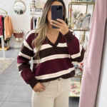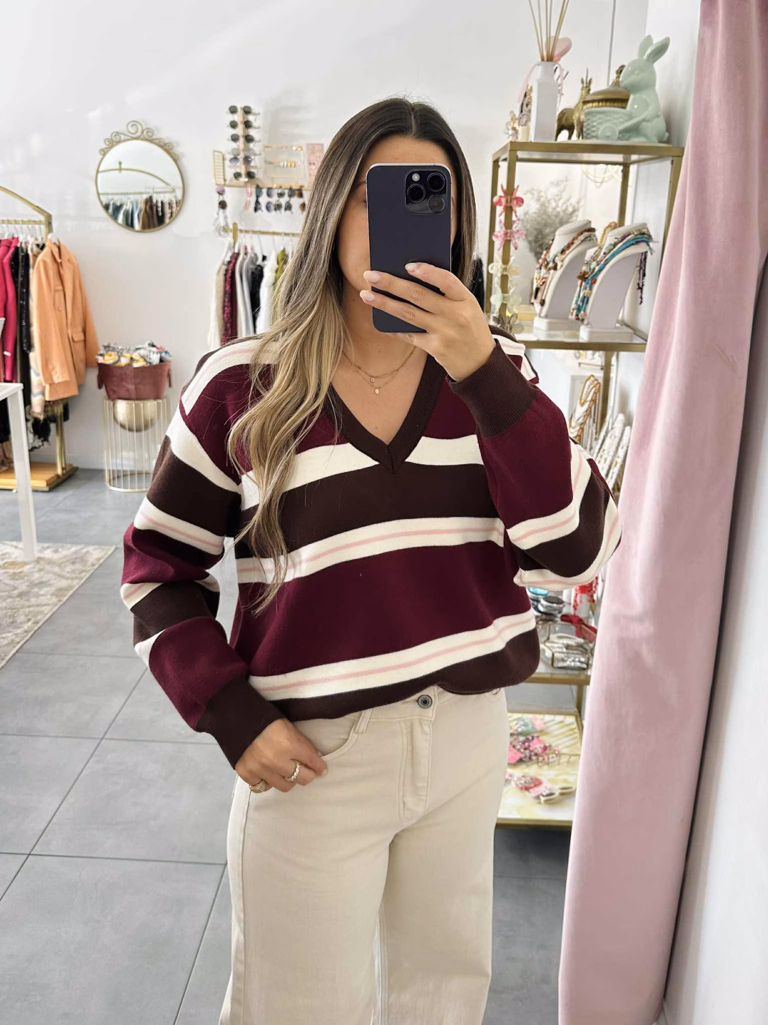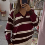 Camisola de malha estilo oversize. Cores bordo, bege e castanho.