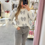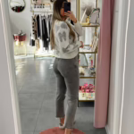 A modelo tem 1,73m e veste o tamanho M parte de cima e um 38/40 de parte de baixo.