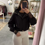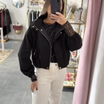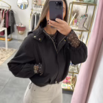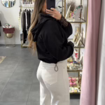 A modelo tem 1,73m e veste o tamanho M/L parte de cima e um 38/40 de parte de baixo.