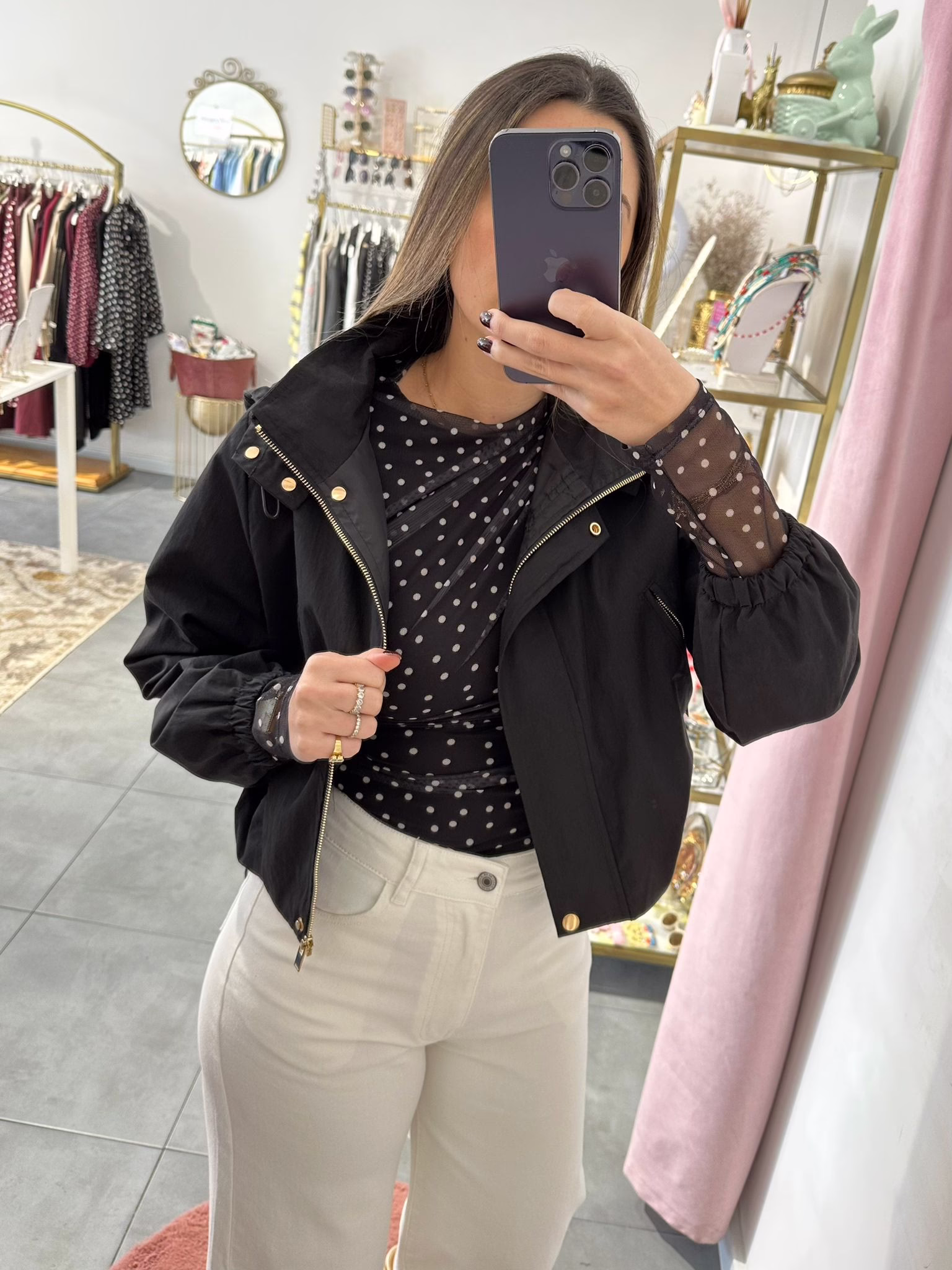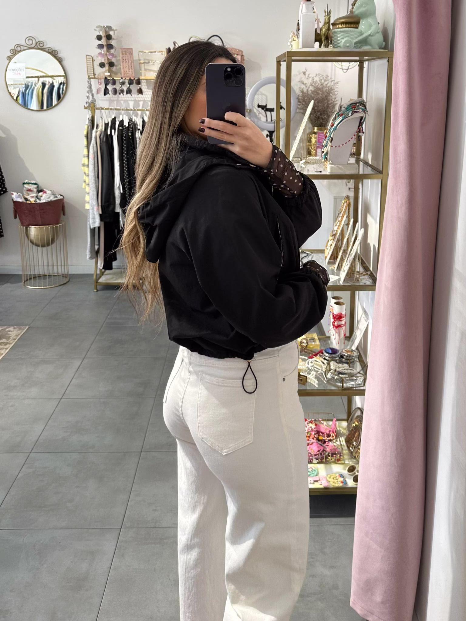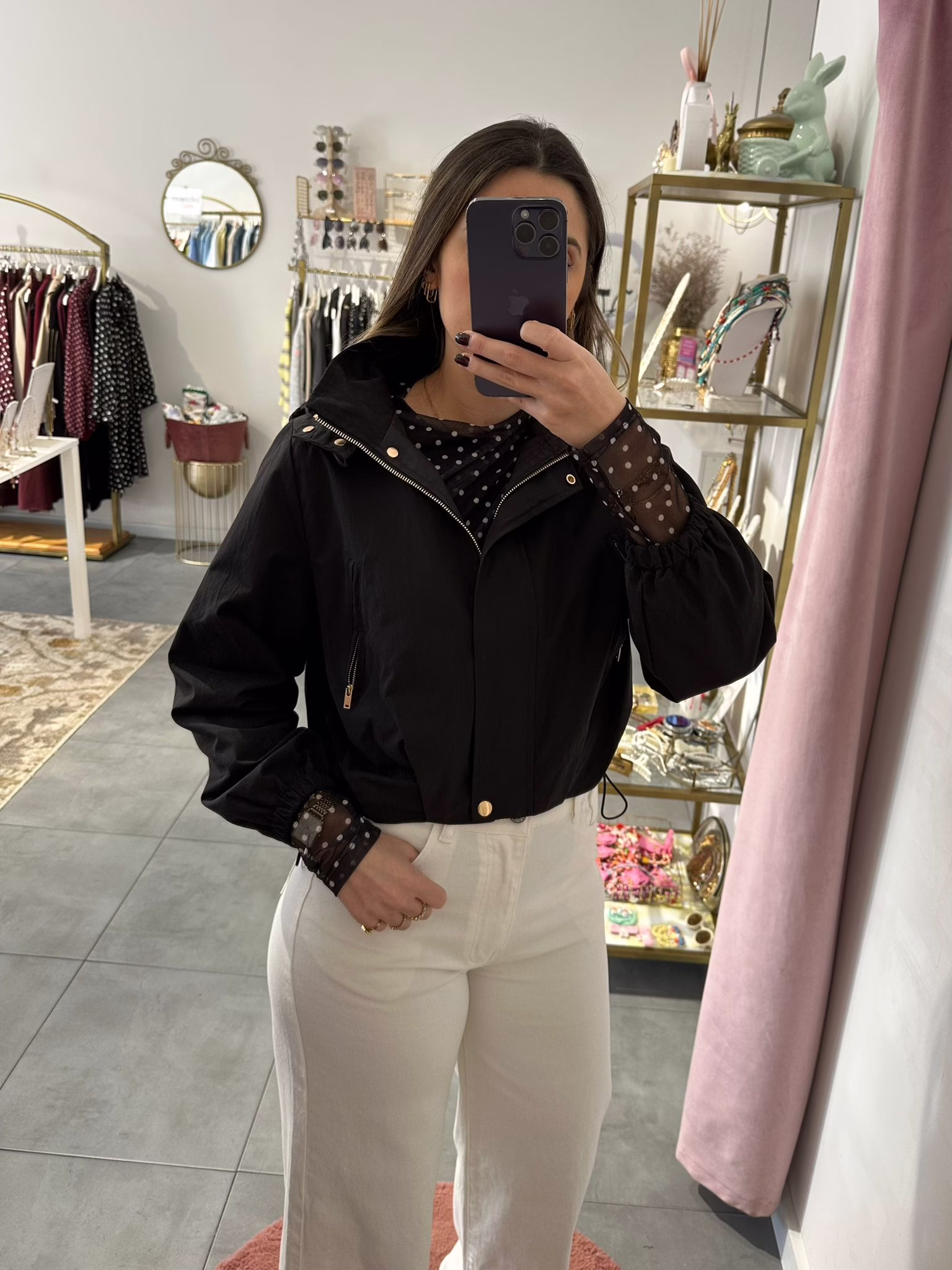 Parka cropped com capcho, aperta com fecho e molas. Tem elástico na zona da cintura e é ajustável.
