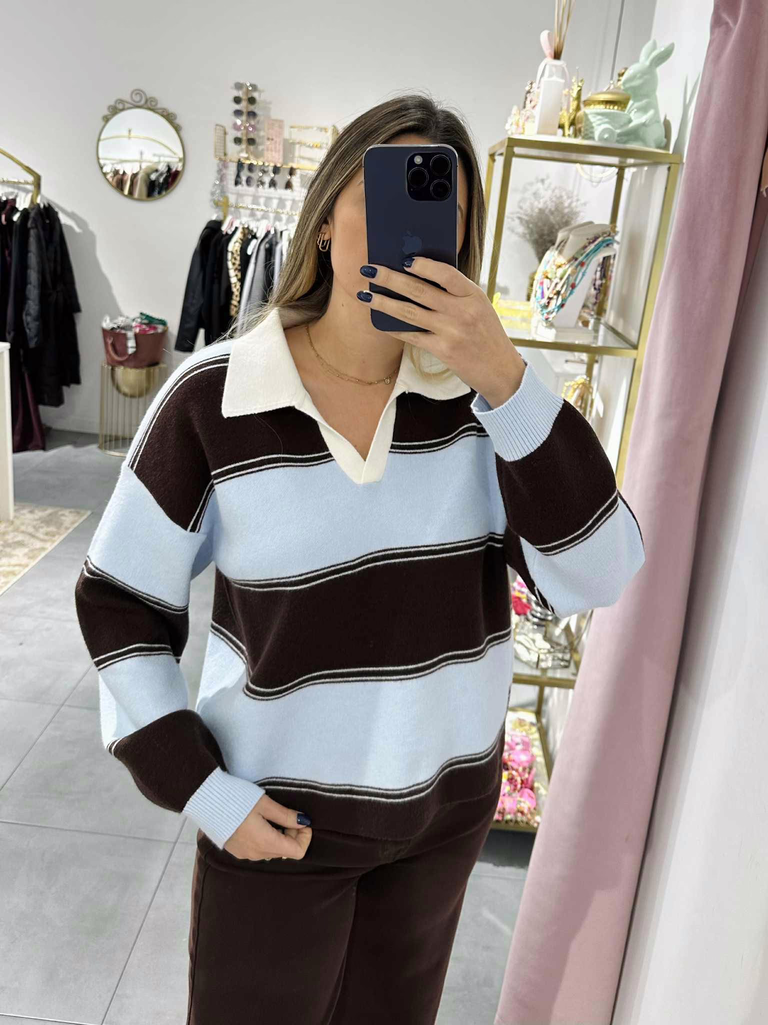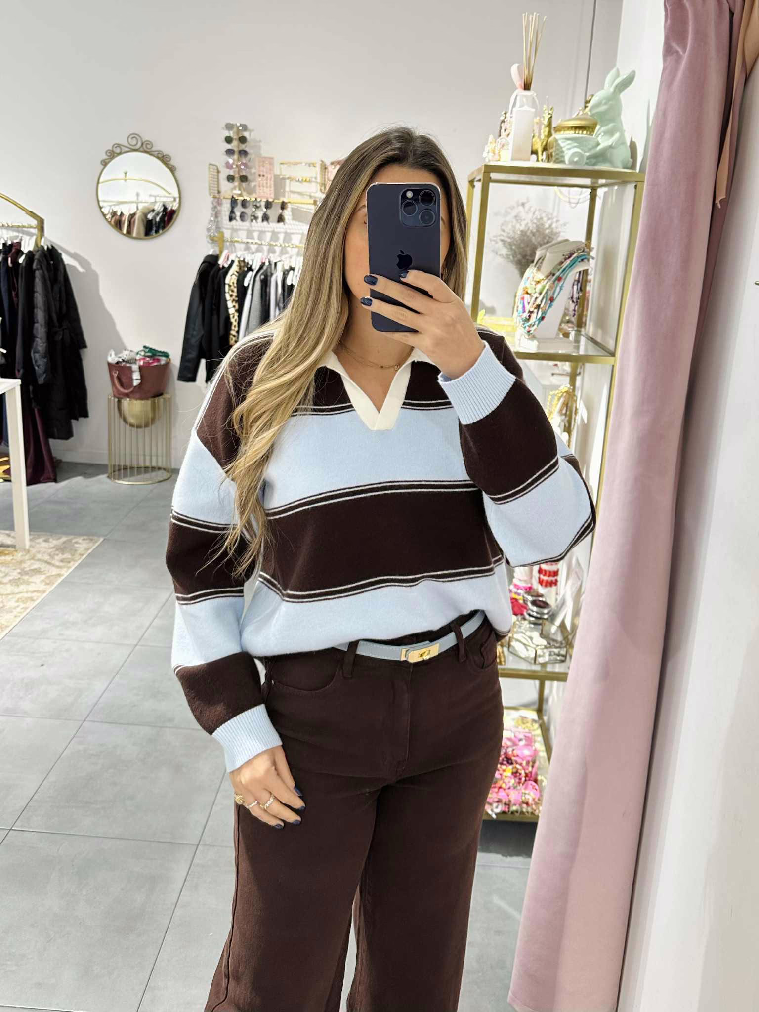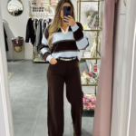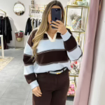 A modelo tem 1,73m e veste o tamanho M/L parte de cima e um 38/40 de parte de baixo.