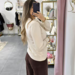 A modelo tem 1,73m e veste o tamanho M/L parte de cima e um 38/40 de parte de baixo.