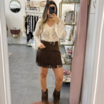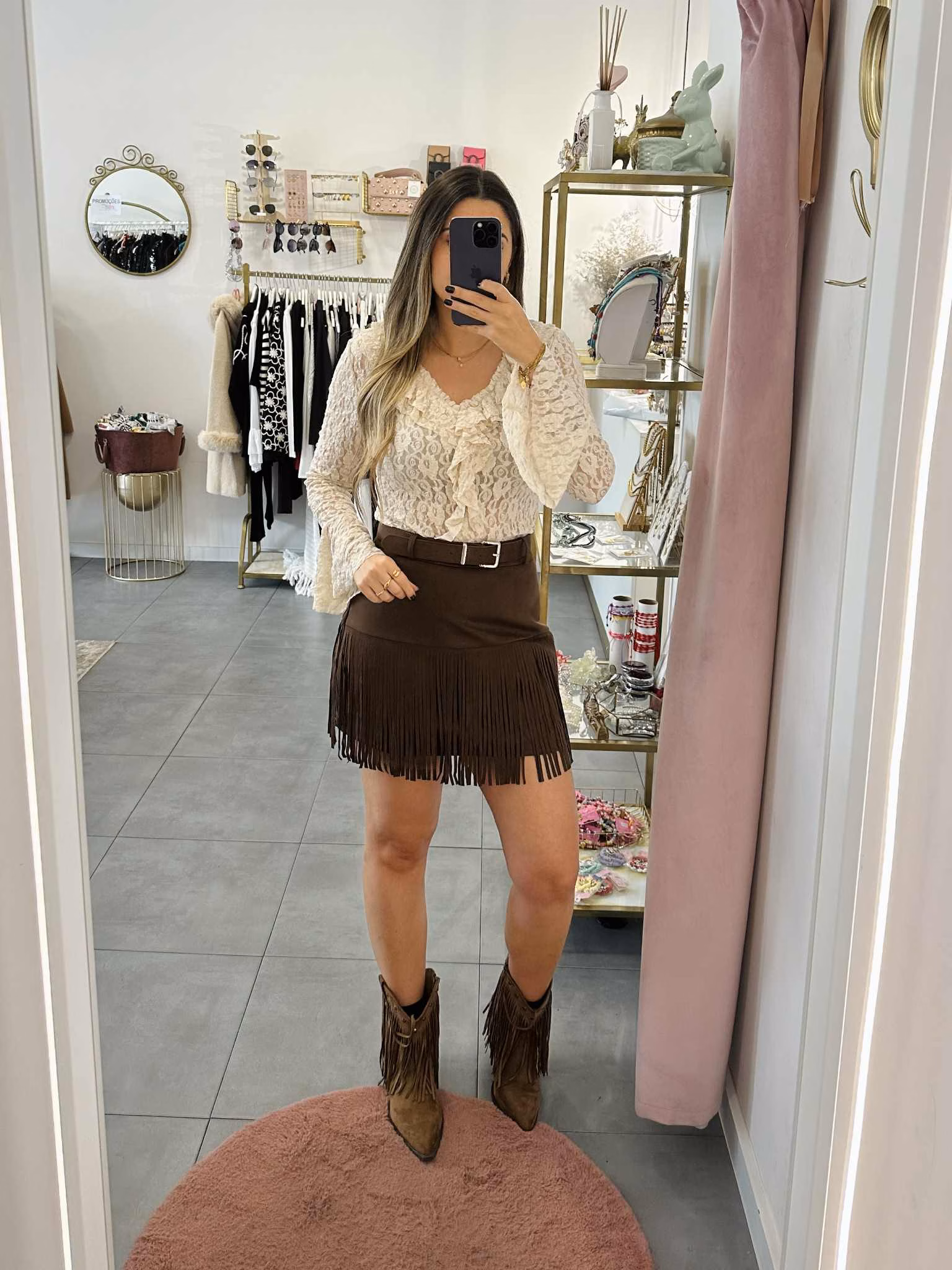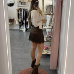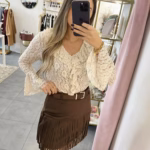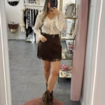 A modelo tem 1,73m e veste o tamanho M/L parte de cima e um 38/40 de parte de baixo.