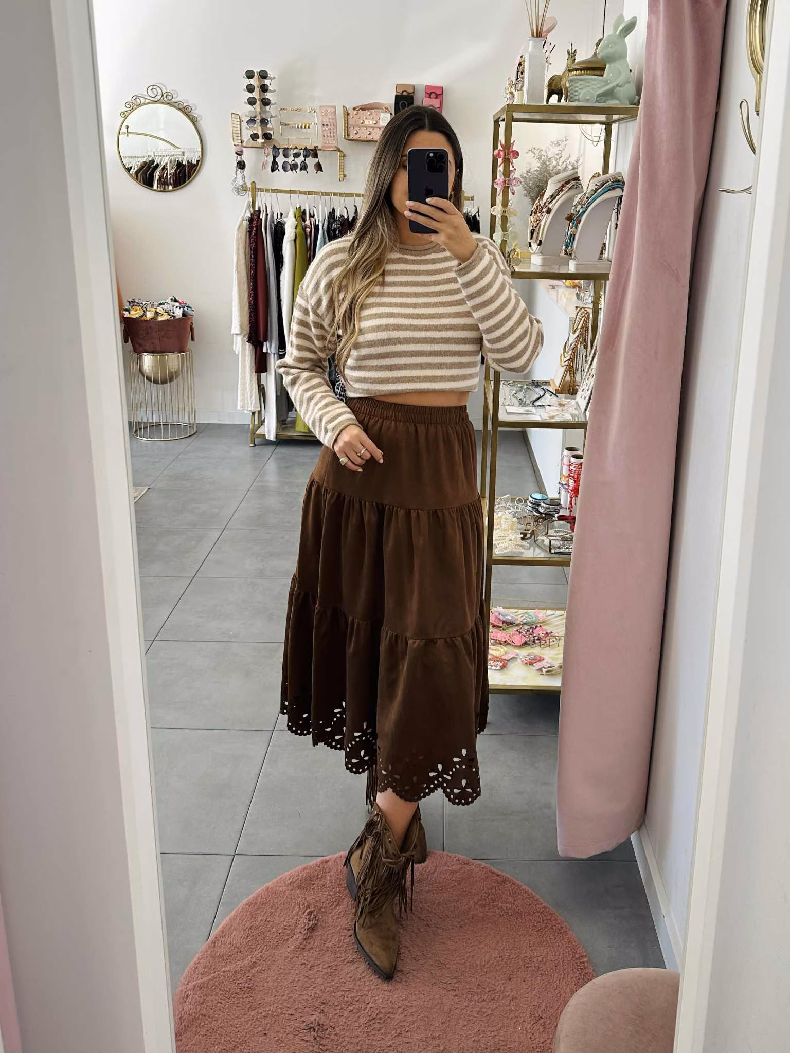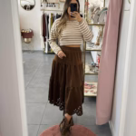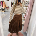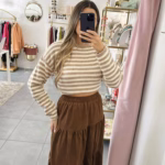 A modelo tem 1,73m e veste o tamanho M/L parte de cima e um 38/40 de parte de baixo.