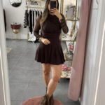 A modelo tem 1,73m e veste o tamanho M/L parte de cima e um 38/40 de parte de baixo.