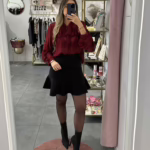 A modelo tem 1,73m e veste o tamanho M/L parte de cima e um 38/40 de parte de baixo.