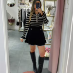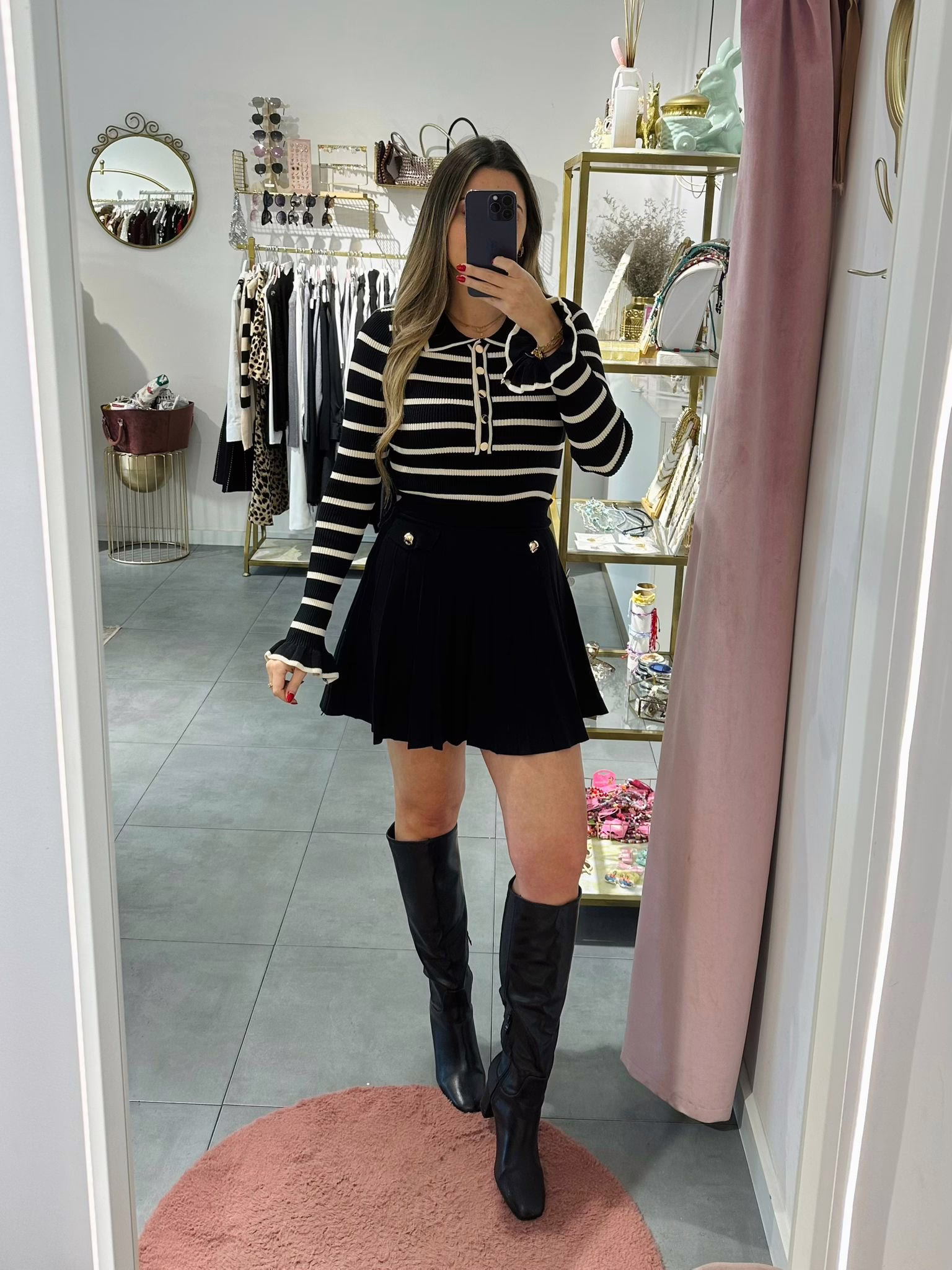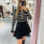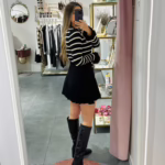 A modelo tem 1,73m e veste o tamanho M/L parte de cima e um 38/40 de parte de baixo.
