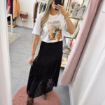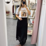 Saia em renda forrada com elástico na cinta.