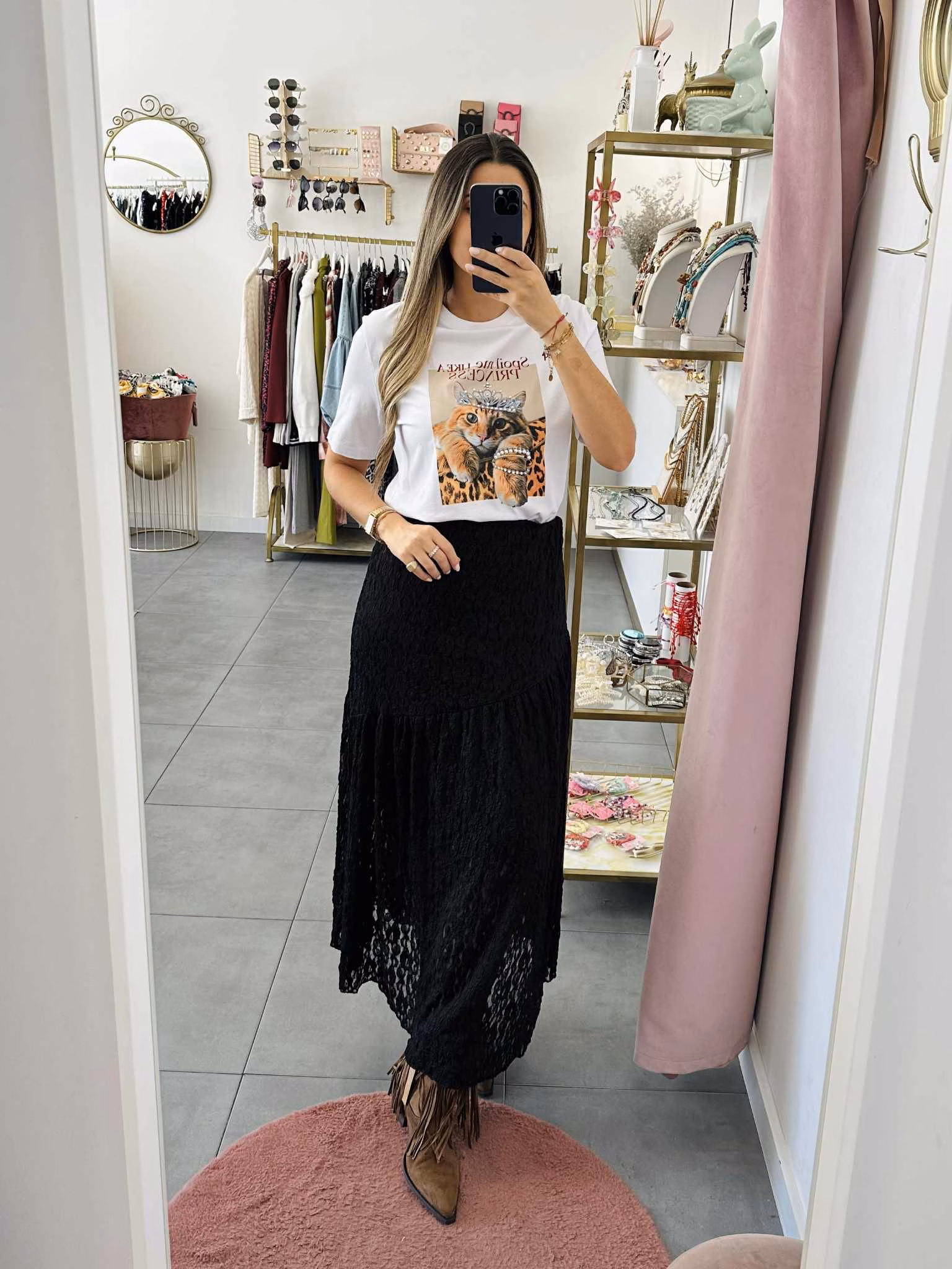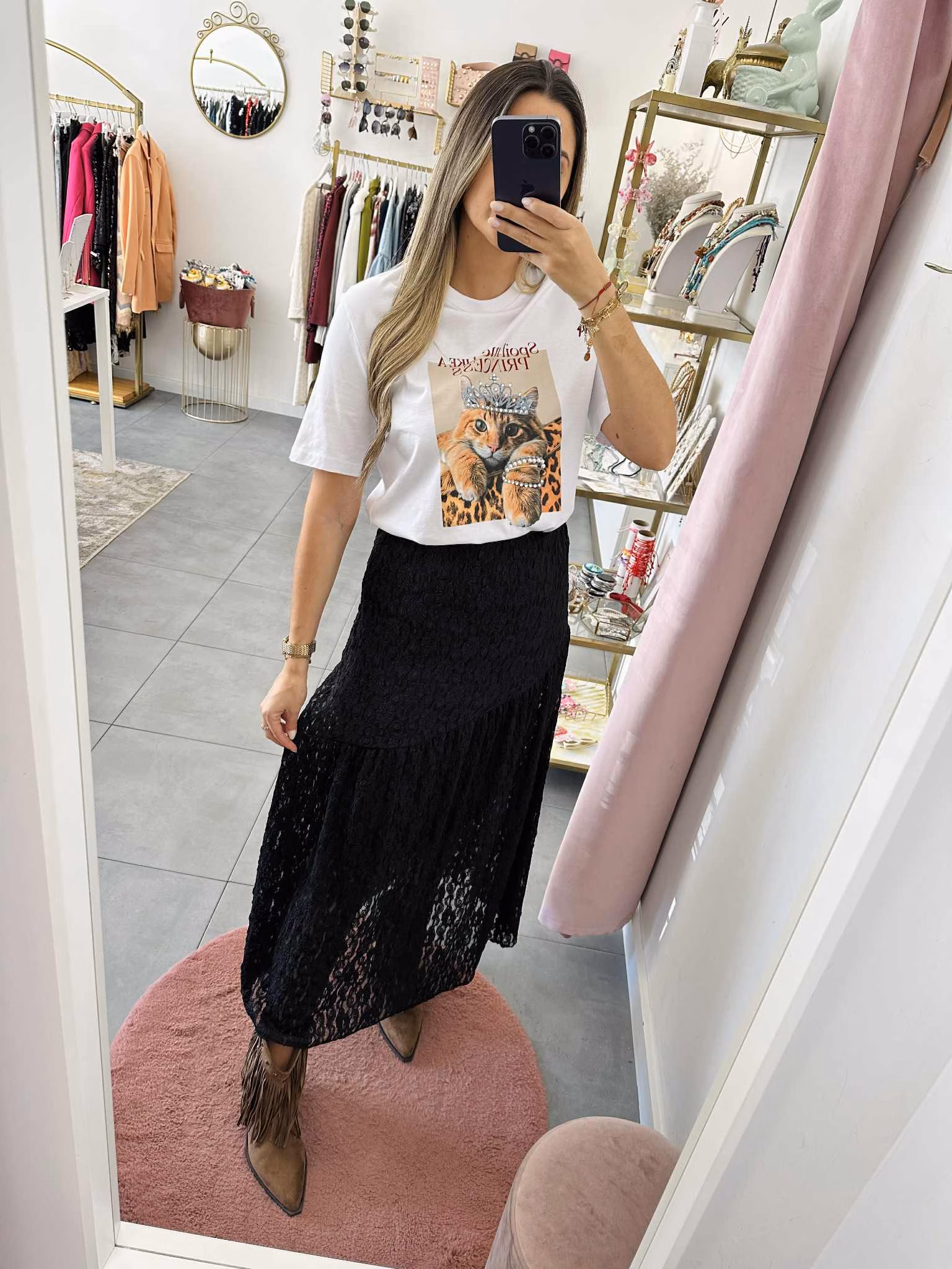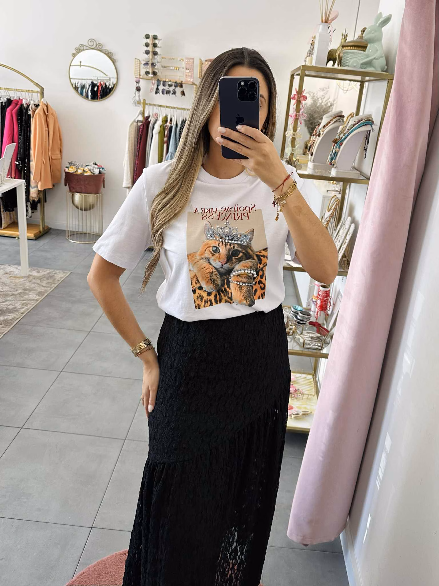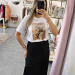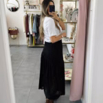 A modelo tem 1,73m e veste o tamanho M/L parte de cima e um 38/40 de parte de baixo.