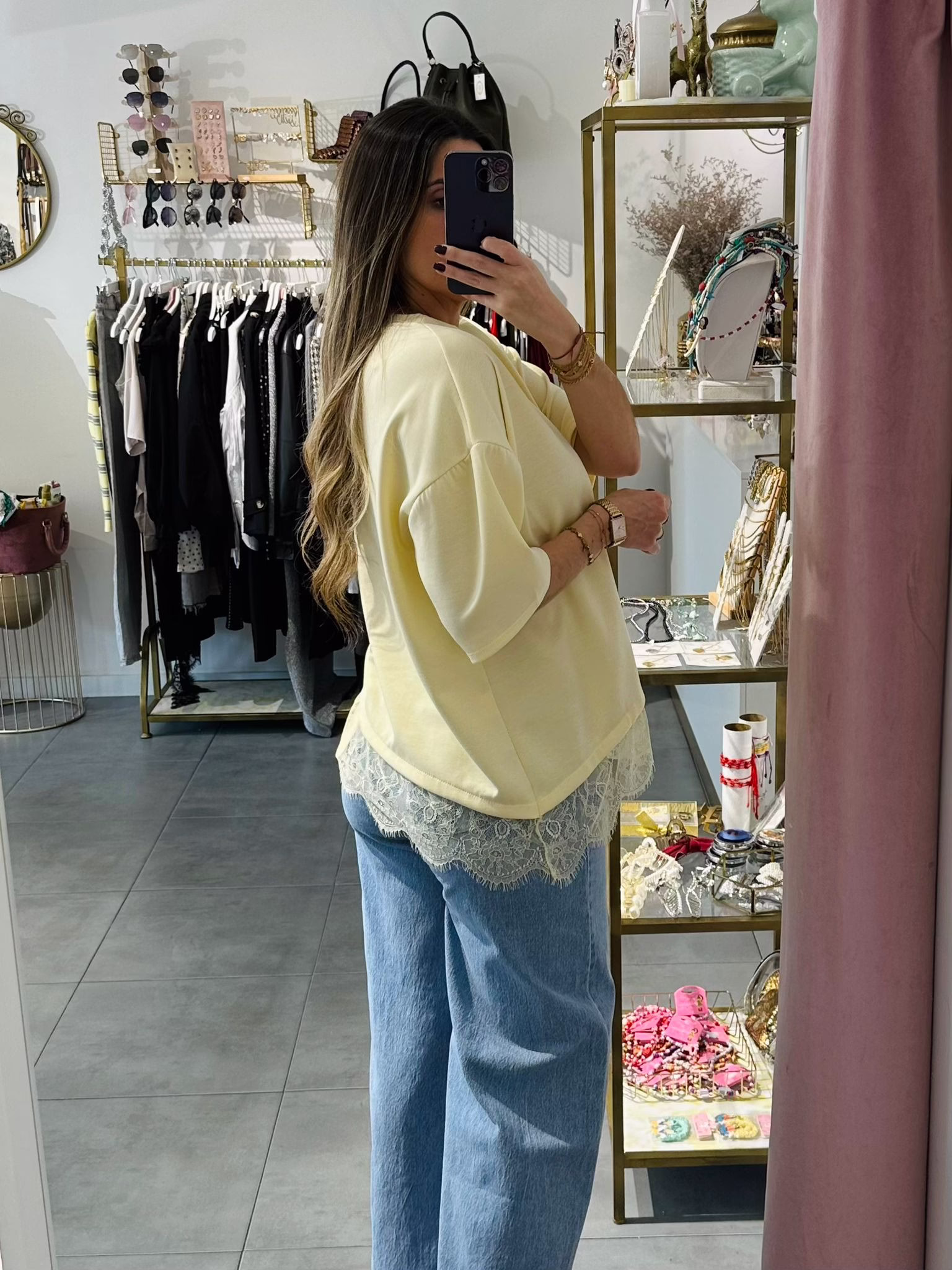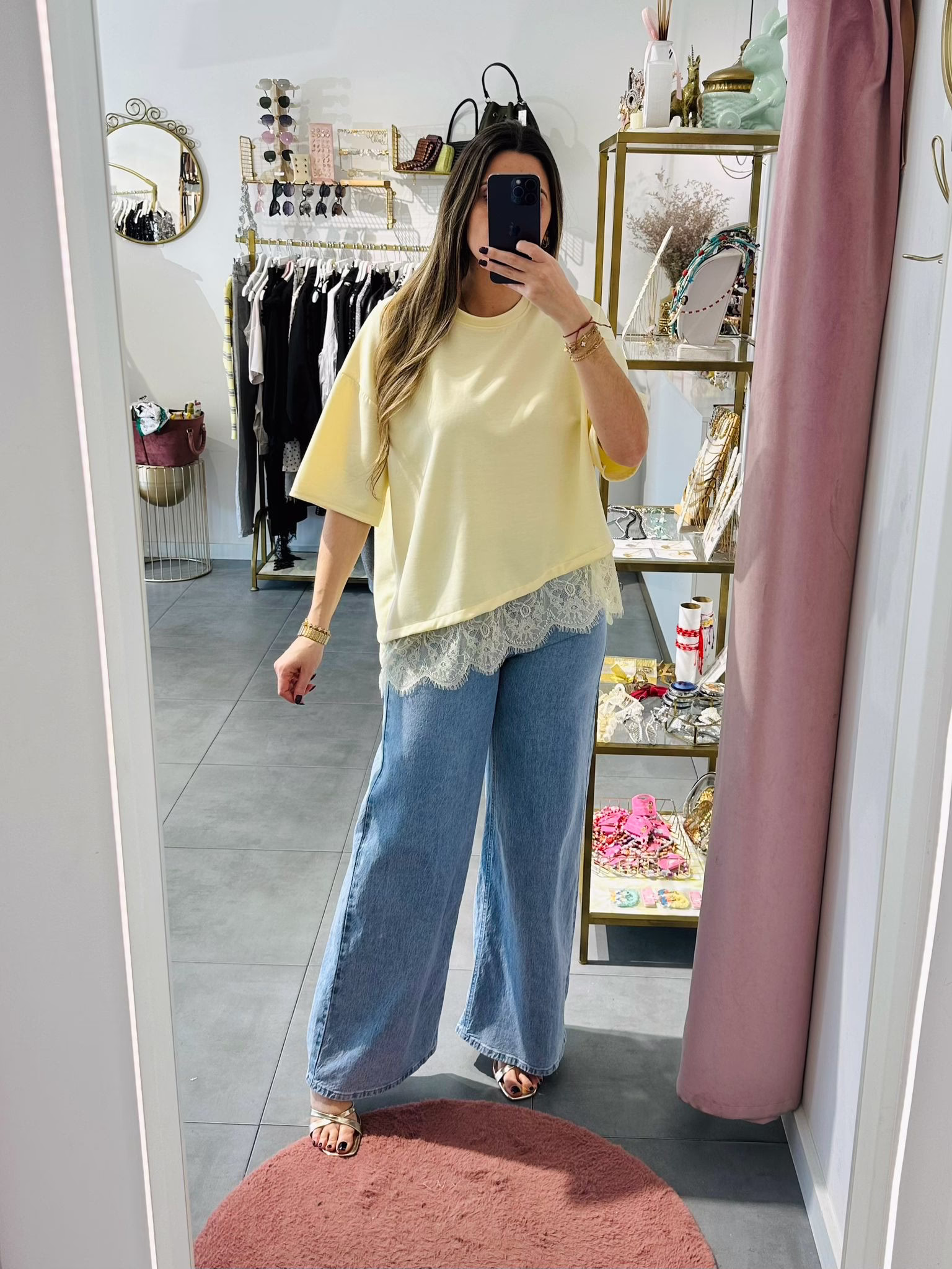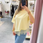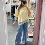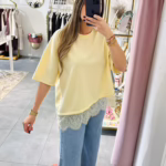A modelo tem 1,73m e veste o tamanho M/L parte de cima e um 38/40 de parte de baixo.