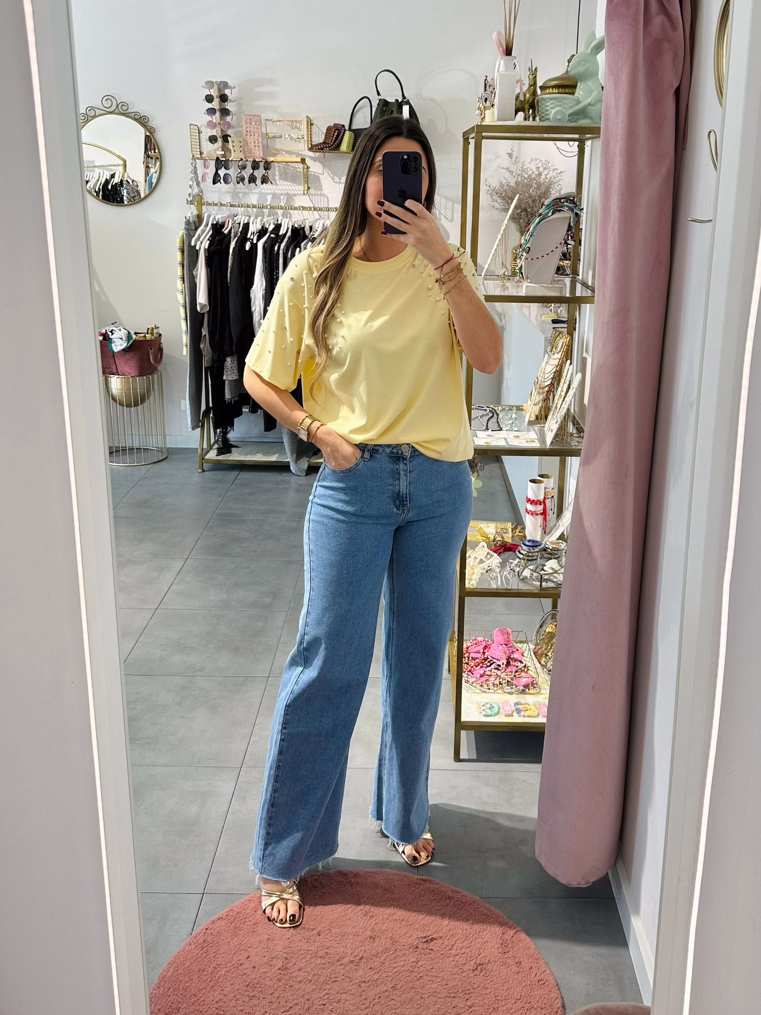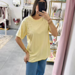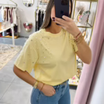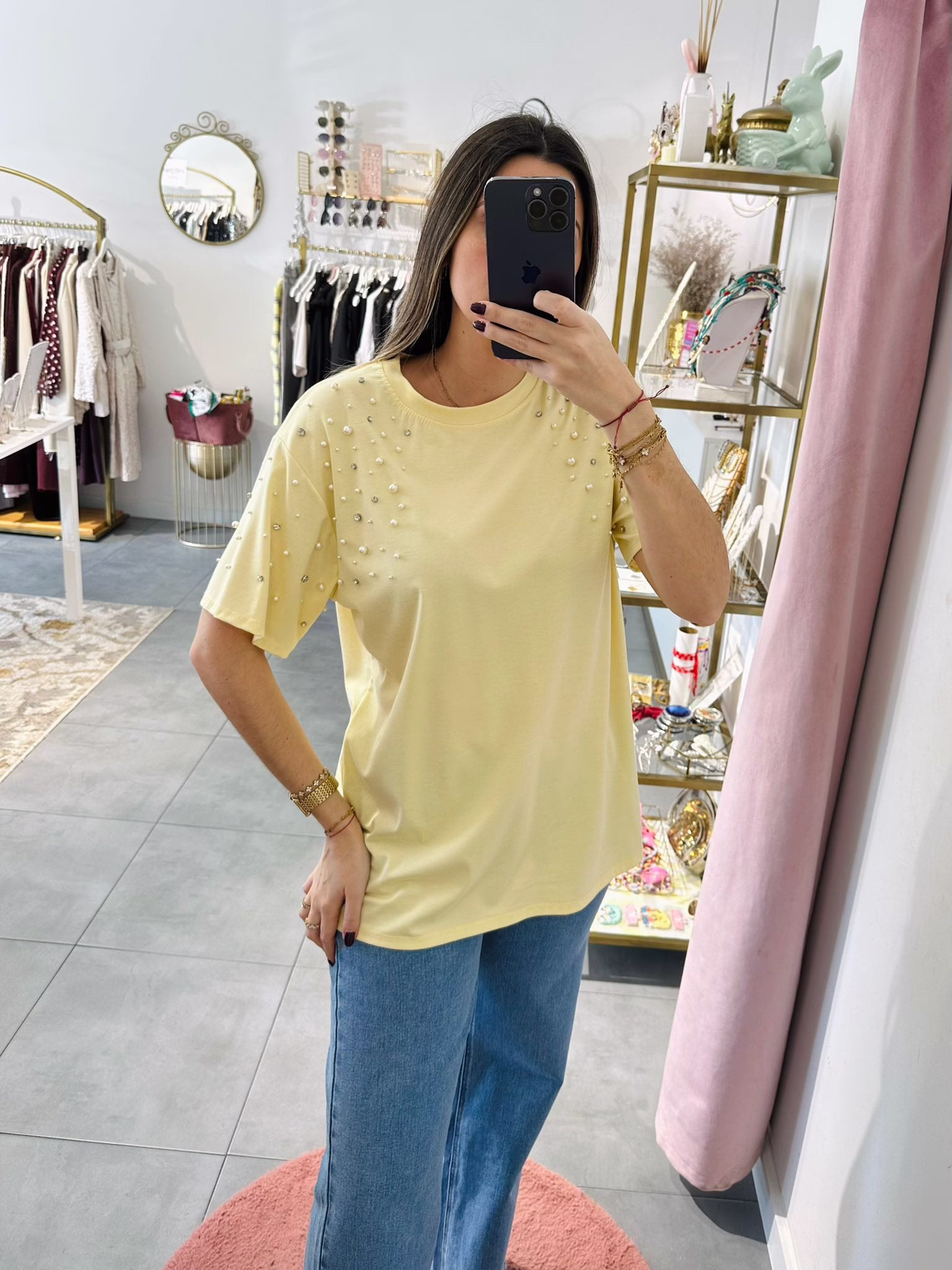 T-Shirt oversize com pérolas e brilhantes cravados.