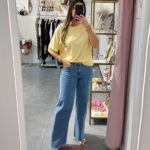A modelo tem 1,73m e veste o tamanho M/L parte de cima e um 38/40 de parte de baixo.