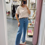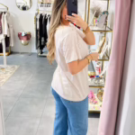 A modelo tem 1,73m e veste o tamanho M/L parte de cima e um 38/40 de parte de baixo.
