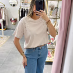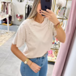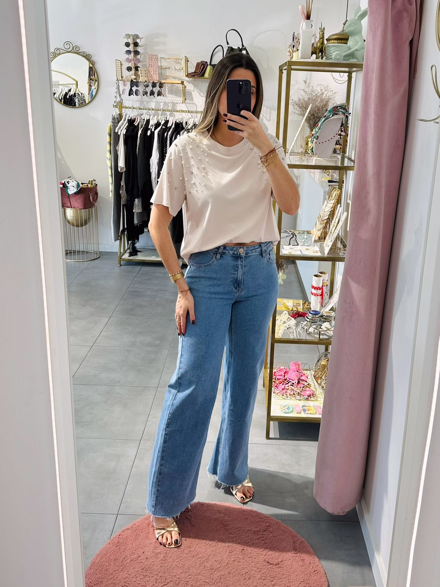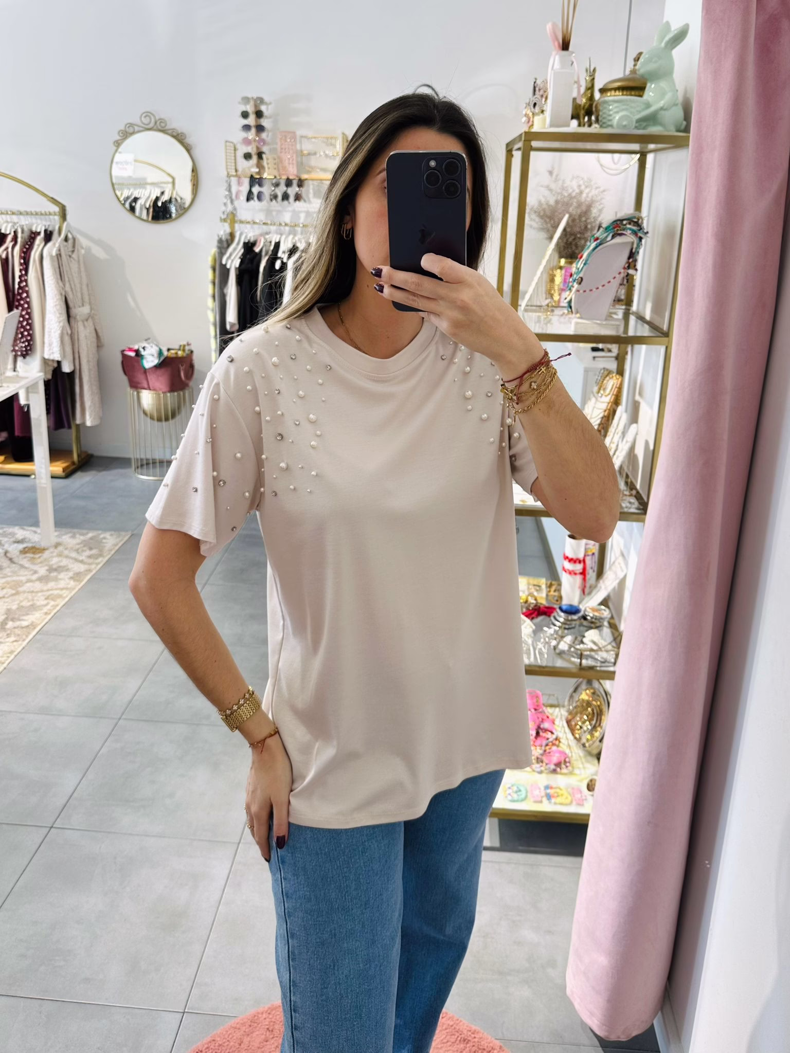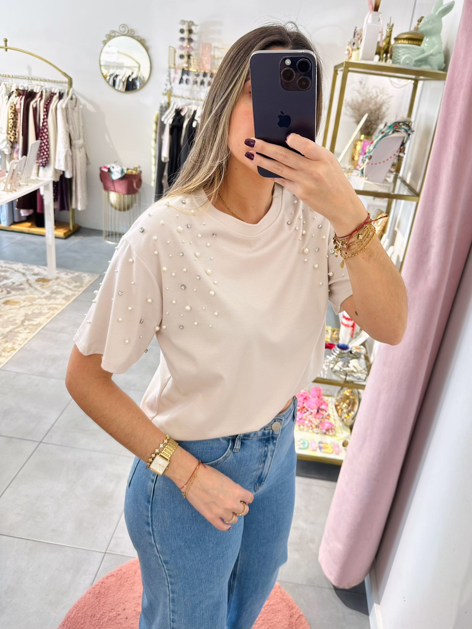 T-Shirt oversize com pérolas e brilhantes cravados.