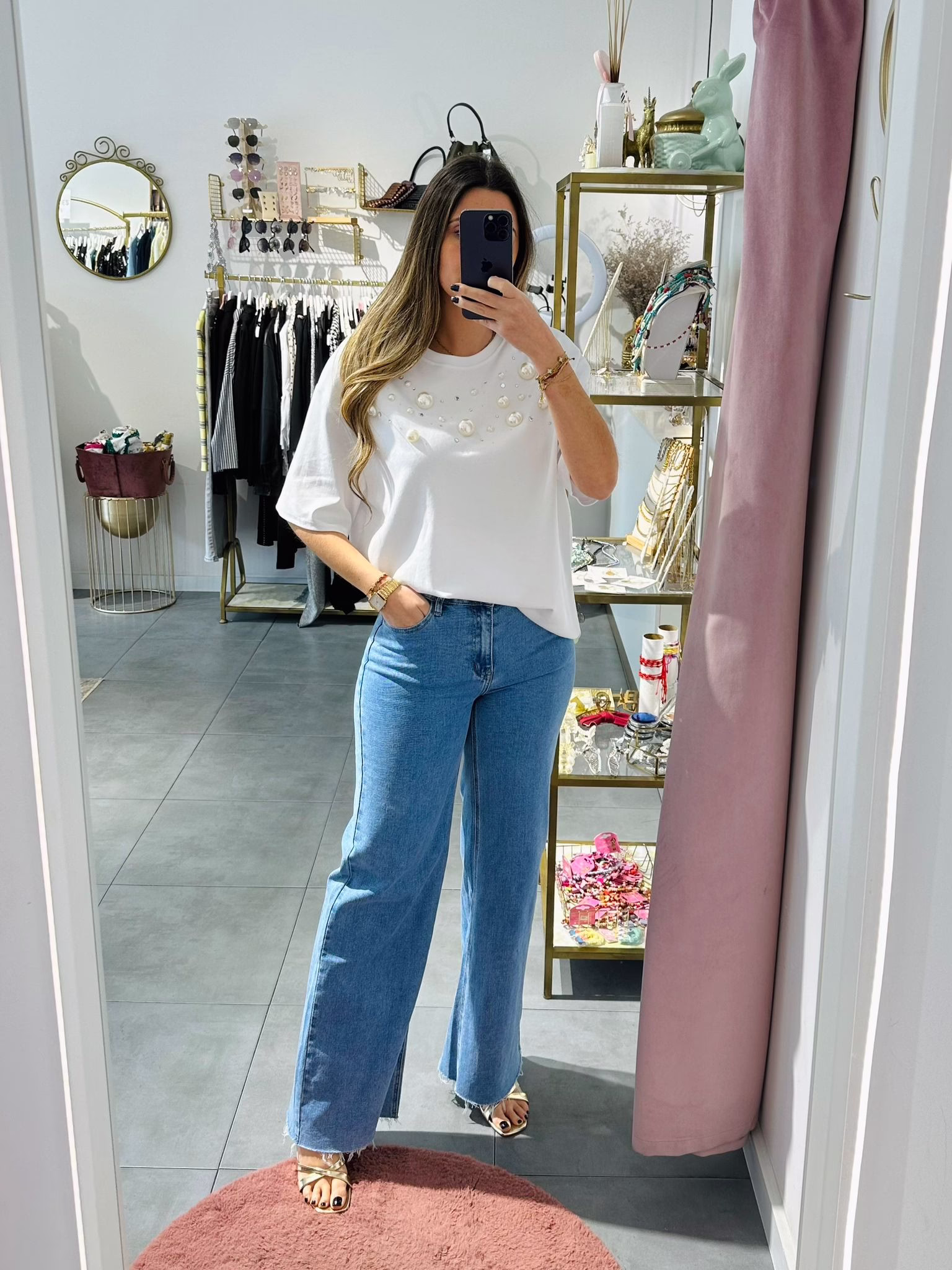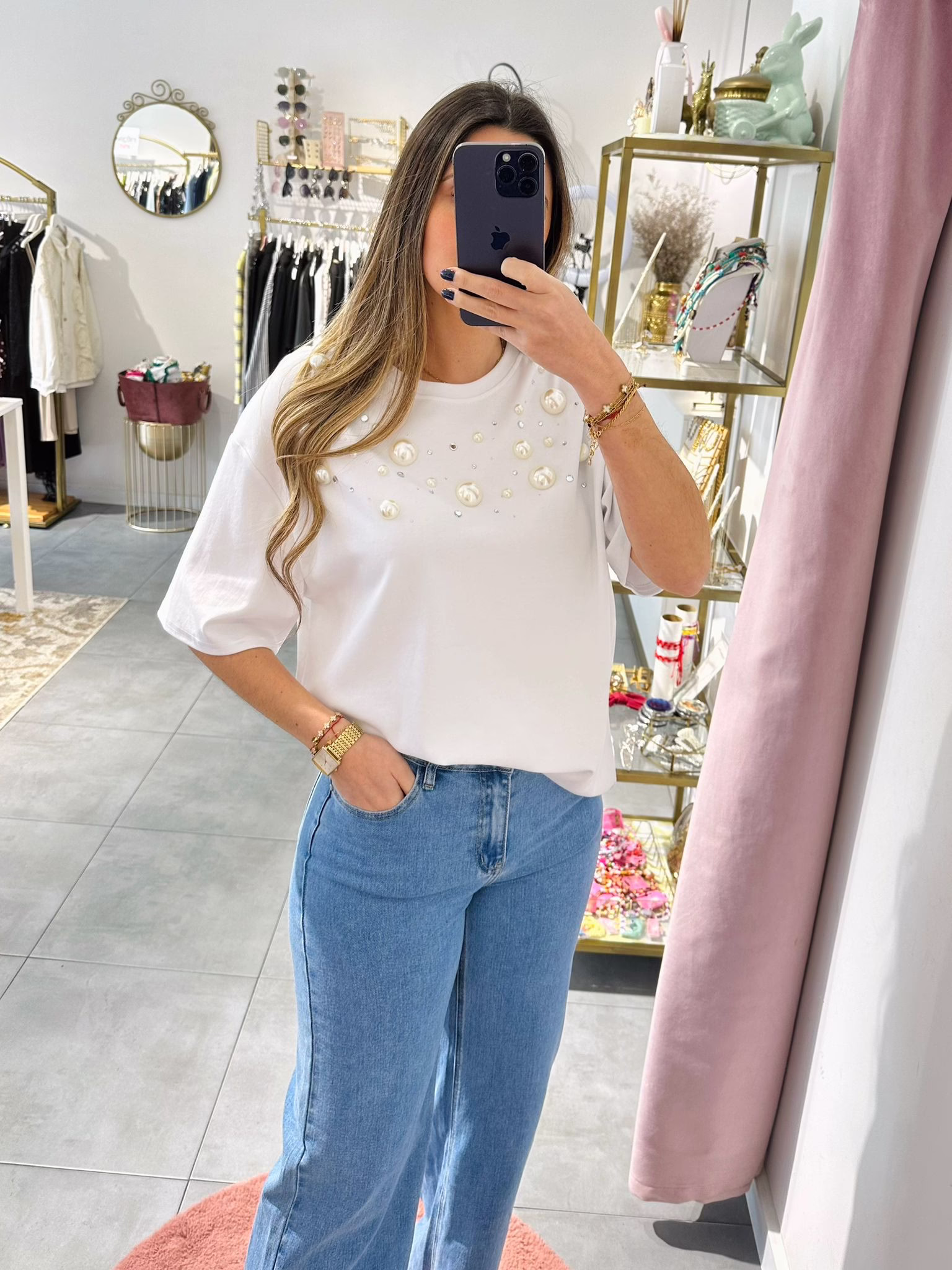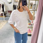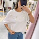 T-shirt oversize com pérolas e brilhantes.