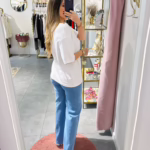 A modelo tem 1,73m e veste o tamanho M/L parte de cima e um 38/40 de parte de baixo.