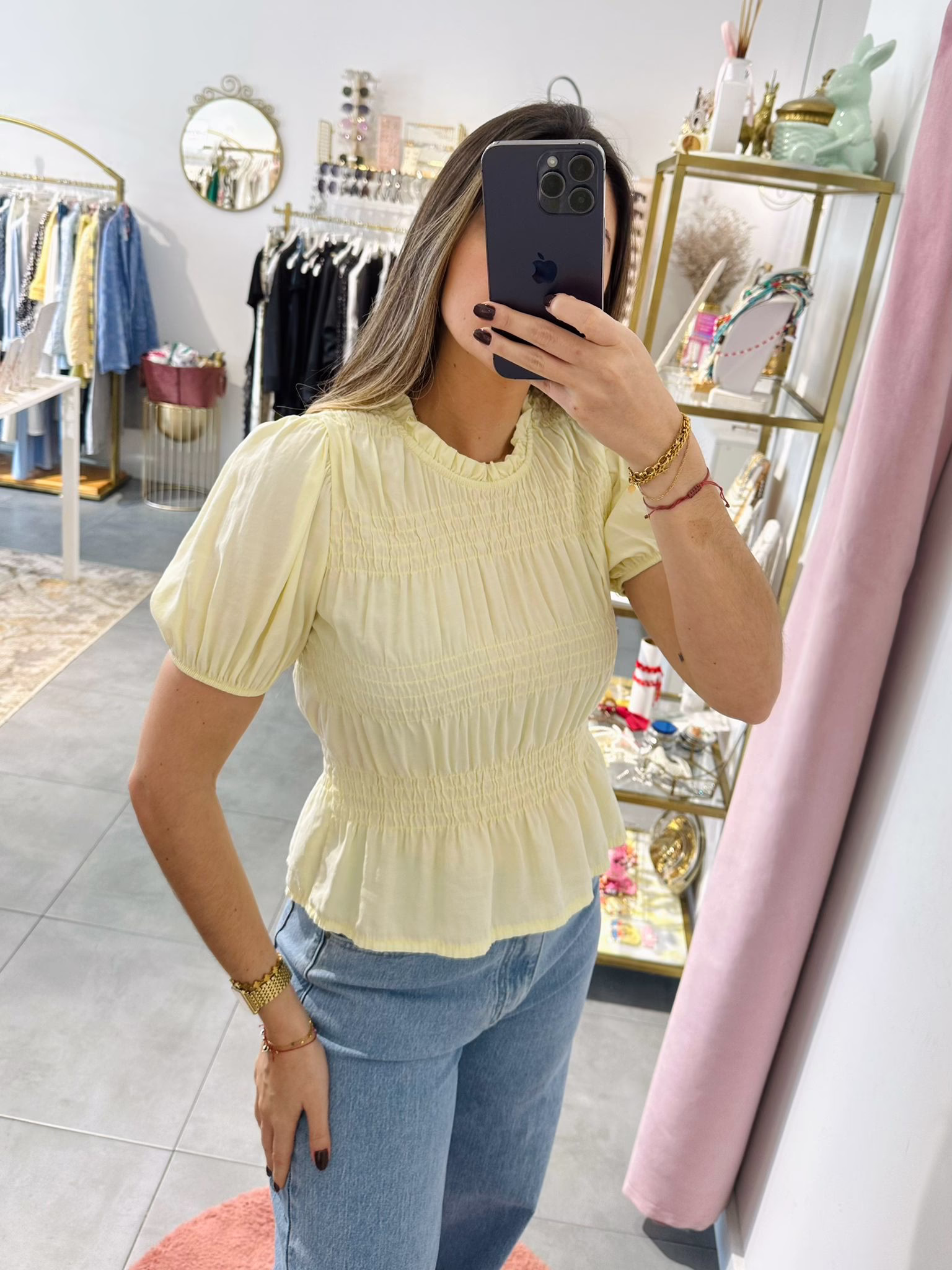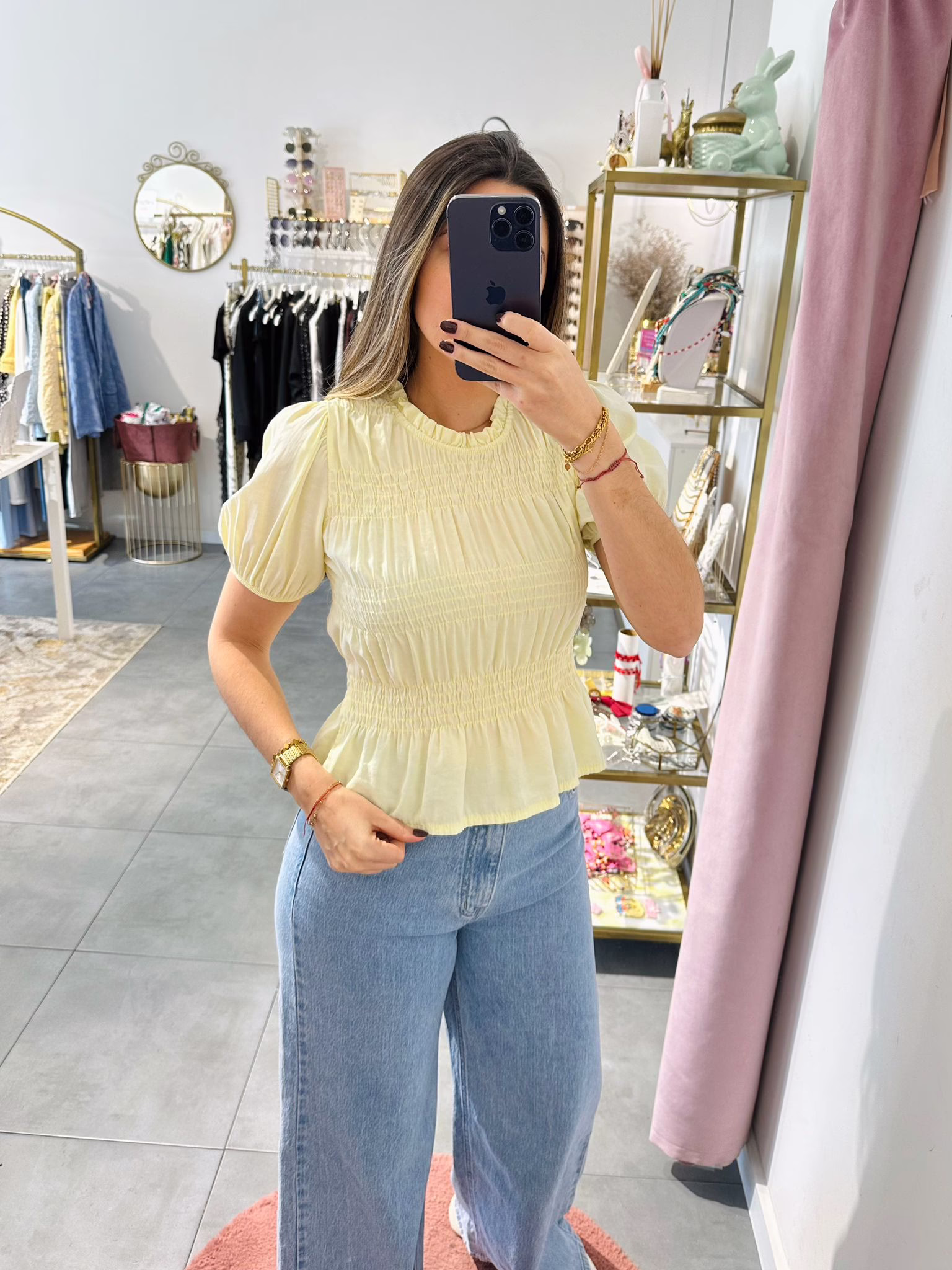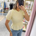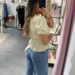 A modelo tem 1,73m e veste o tamanho M/L parte de cima e um 38/40 de parte de baixo.