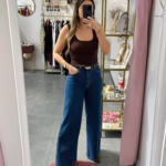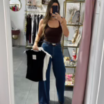 A modelo tem 1,73m e veste o tamanho M/L parte de cima e um 38/40 de parte de baixo.