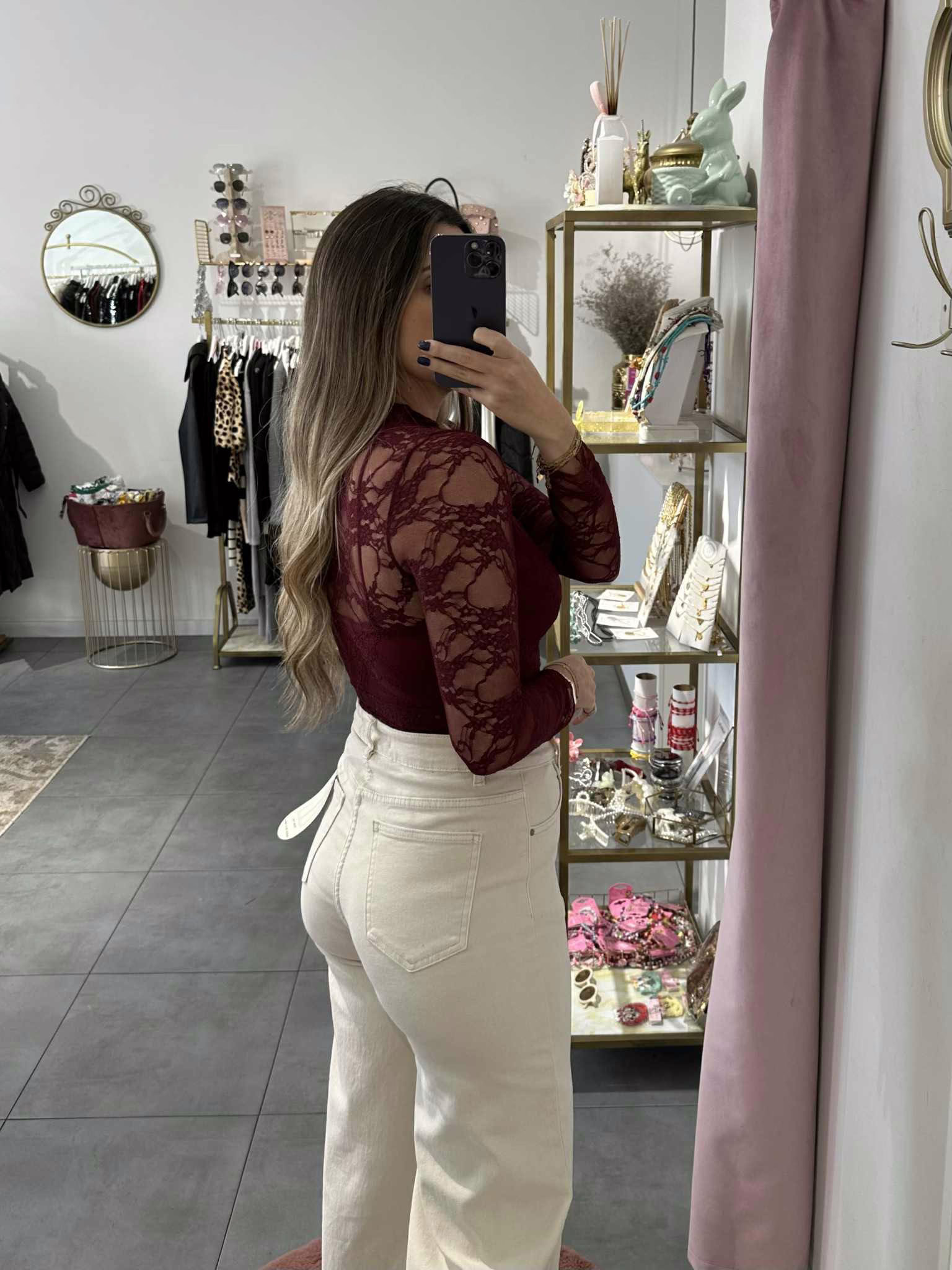 A modelo tem 1,73m e veste o tamanho M/L parte de cima e um 38/40 de parte de baixo.