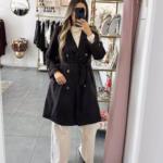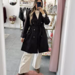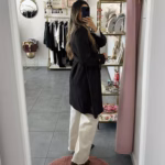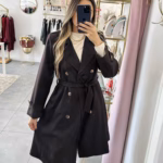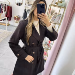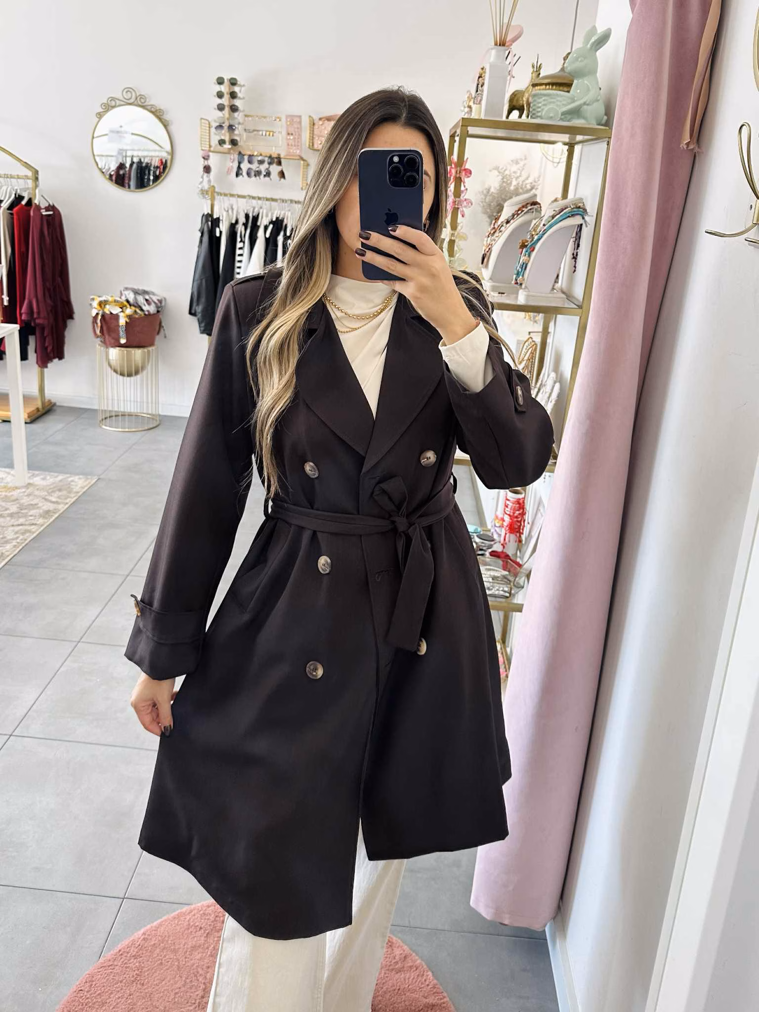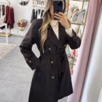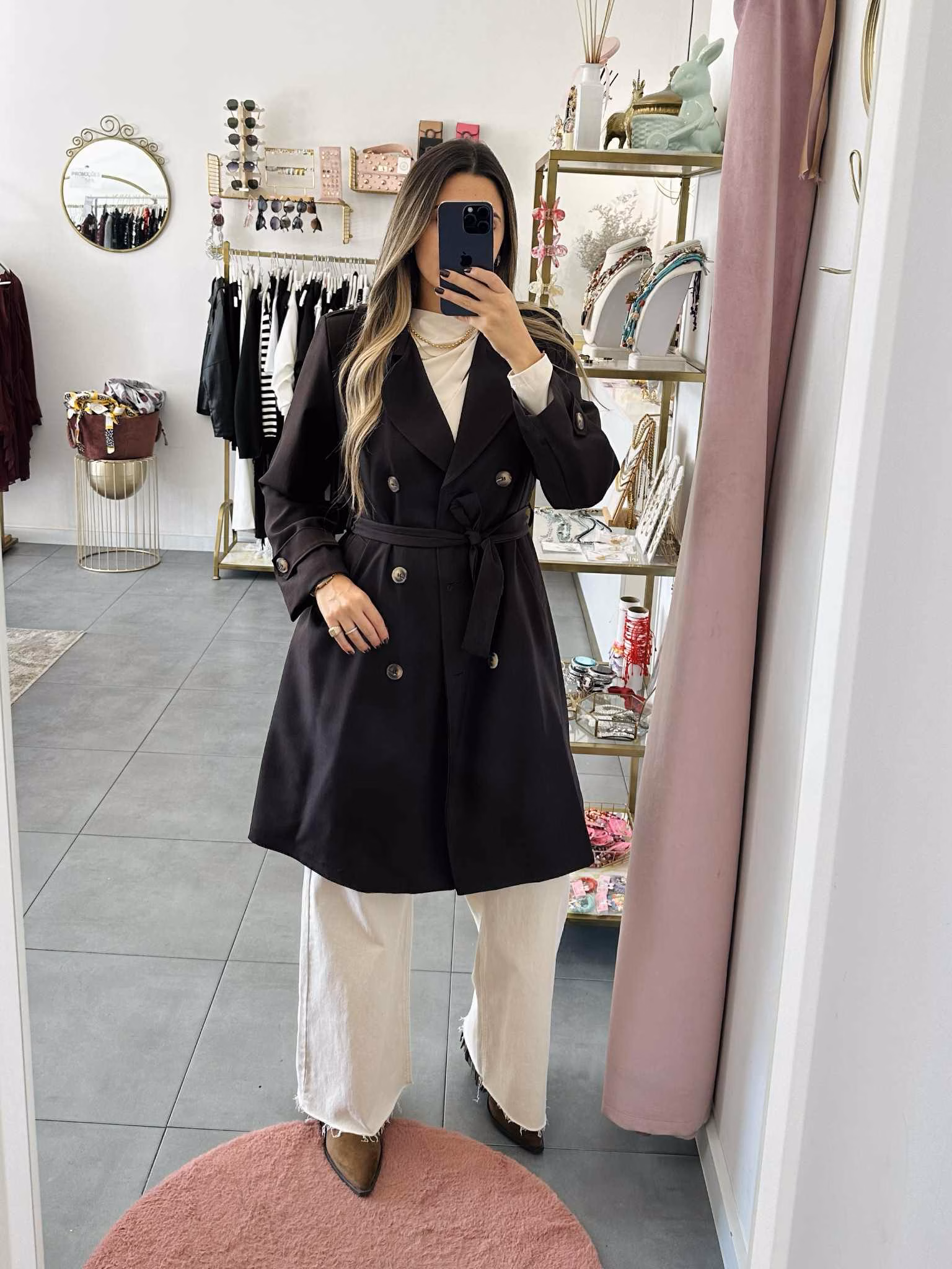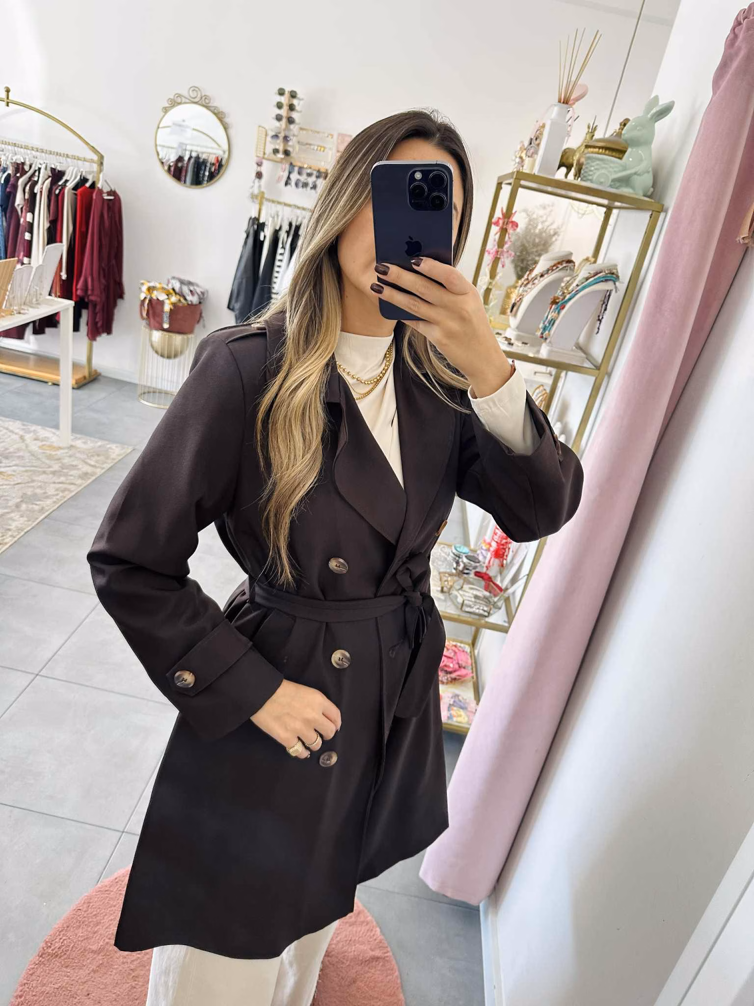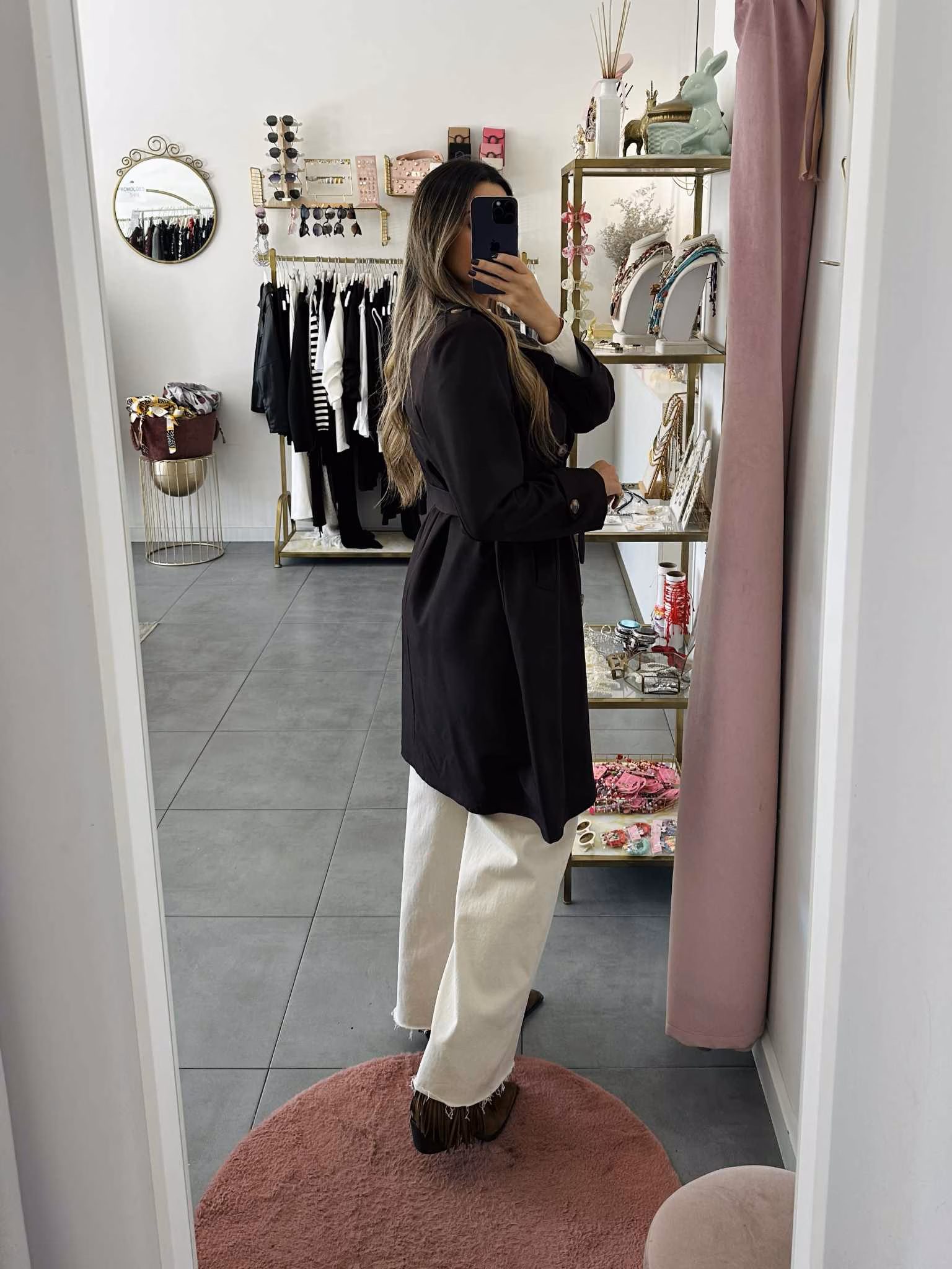 Casaco em tecido, com bolsos e cinto. É forrado.
