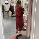 A modelo tem 1,73m e veste o tamanho M/L parte de cima e um 38/40 de parte de baixo.