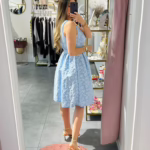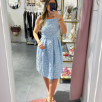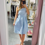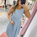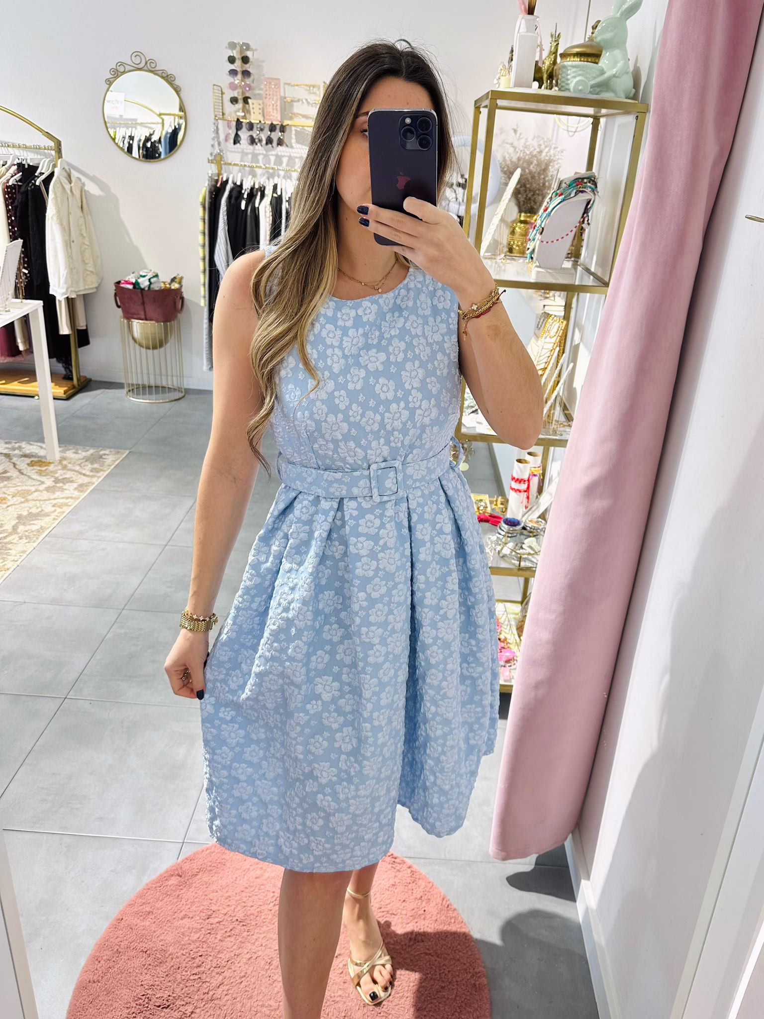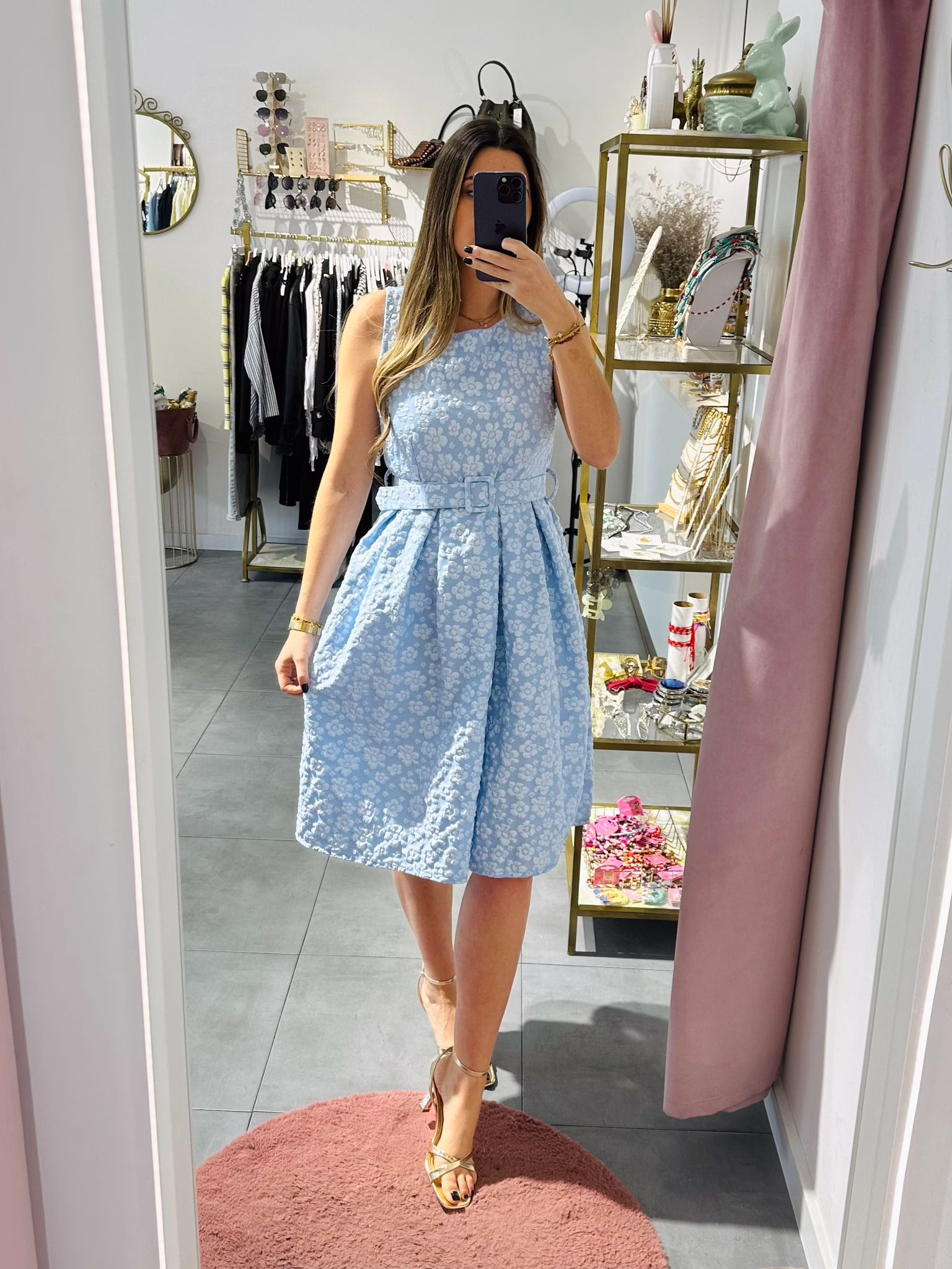 Vestido em tecido com relevo, tem elástico na cintura e cinto.