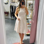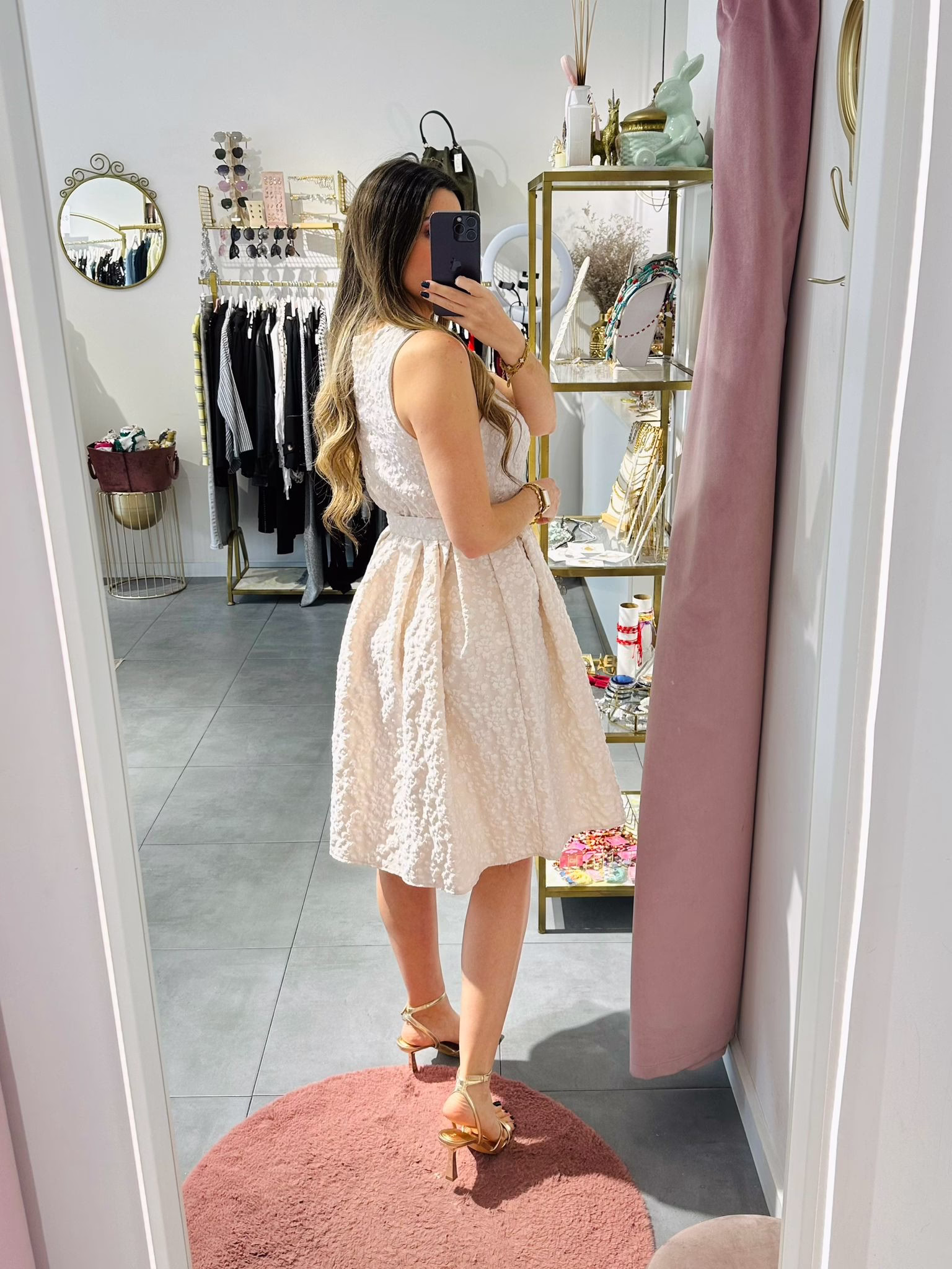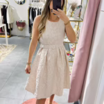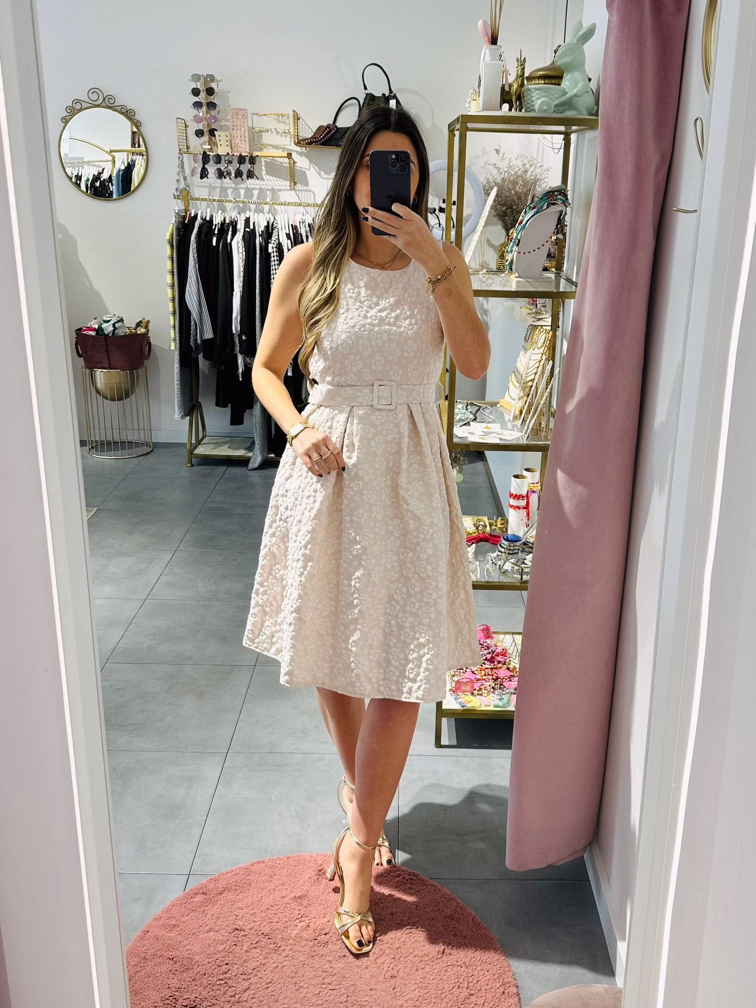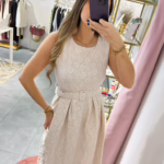 Vestido em tecido com relevo, tem elástico na cintura e cinto.