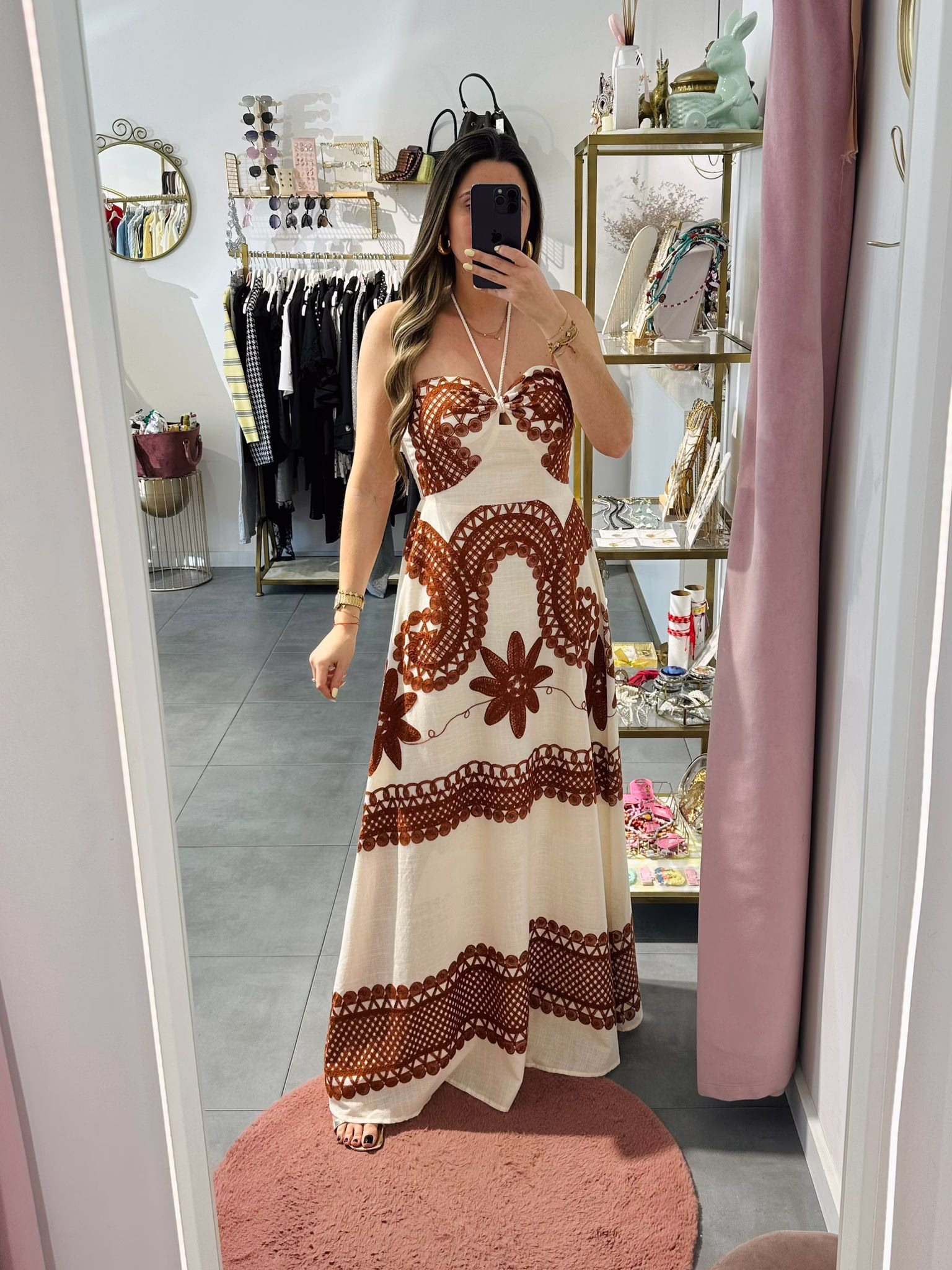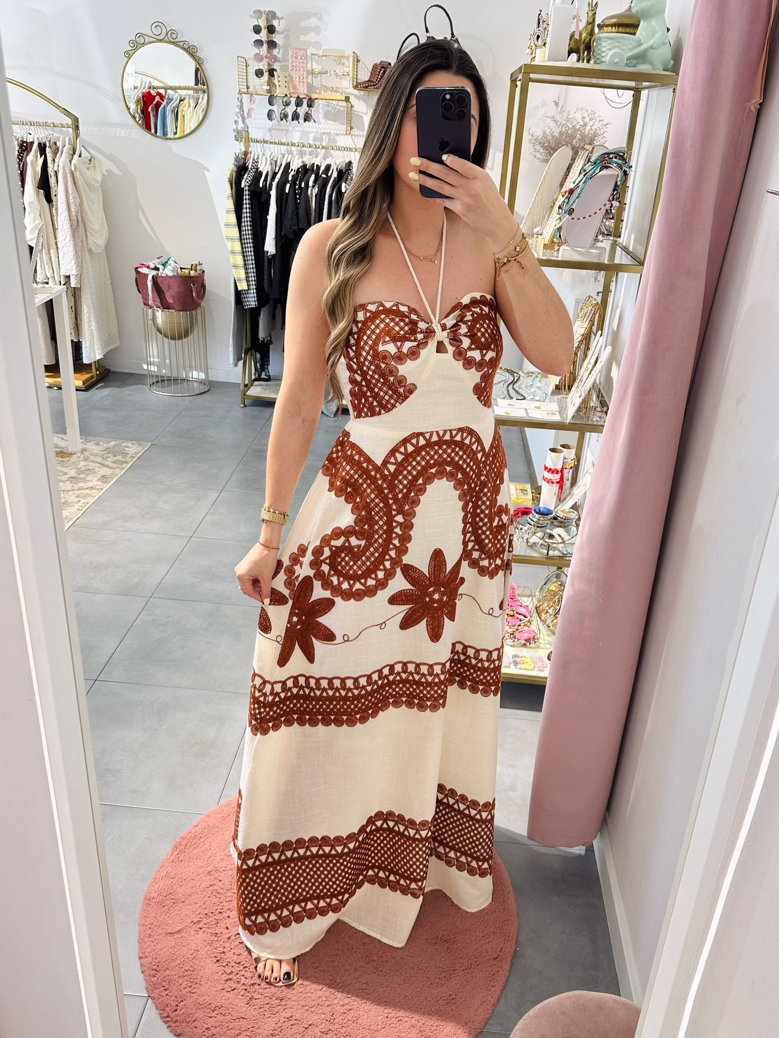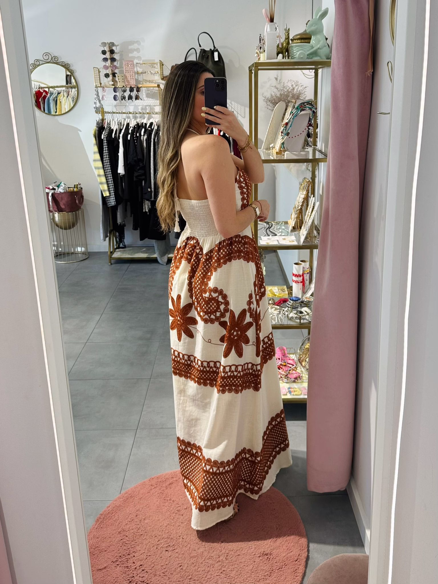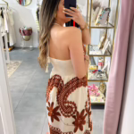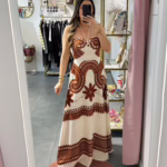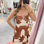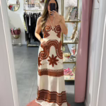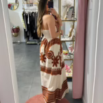 Vestido comprido bge com bordados em laranja, as costas são elásticas.