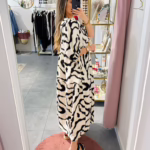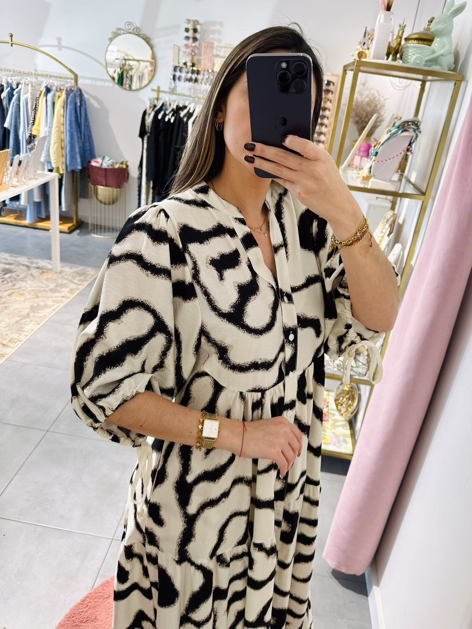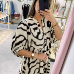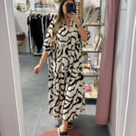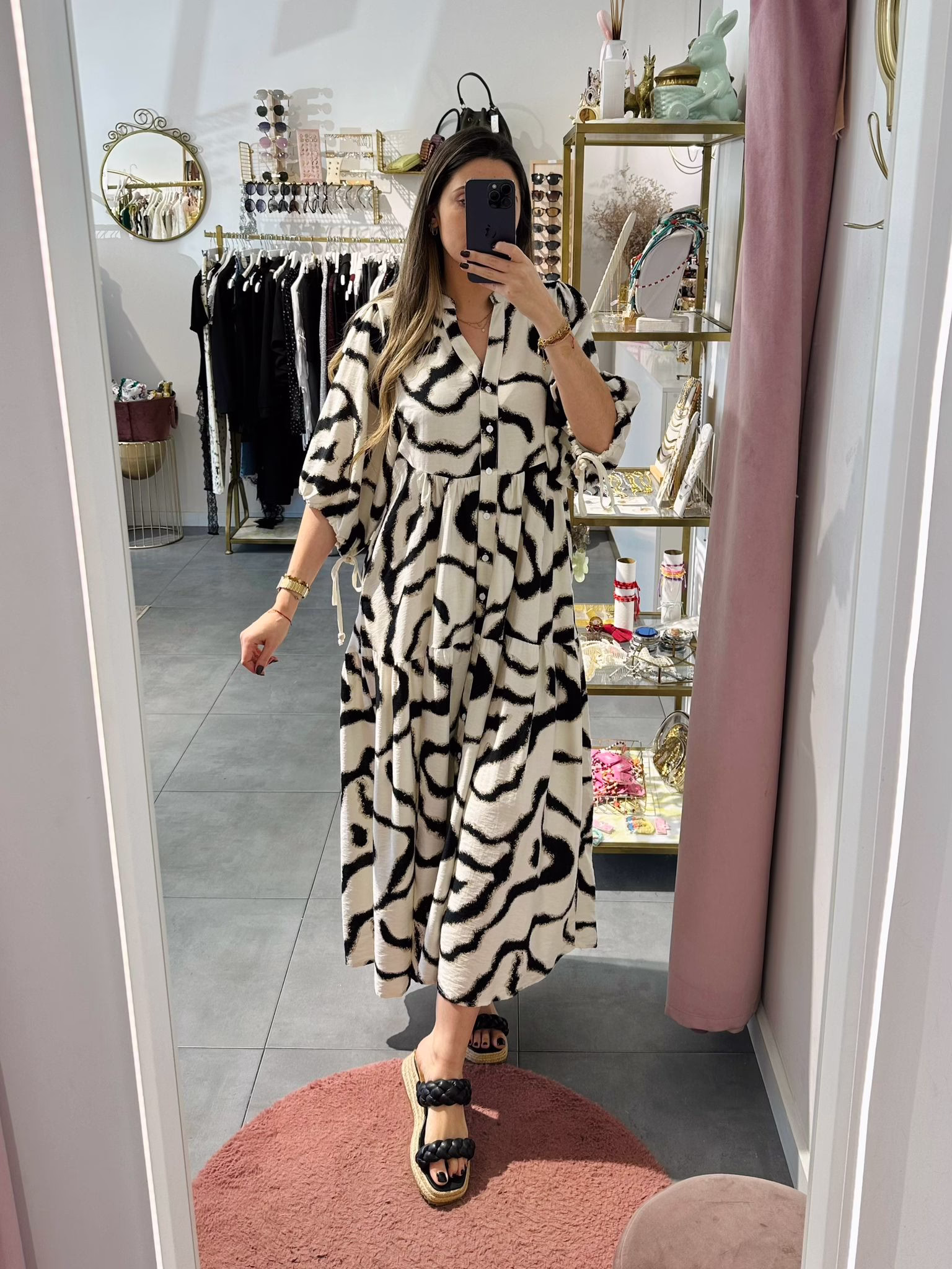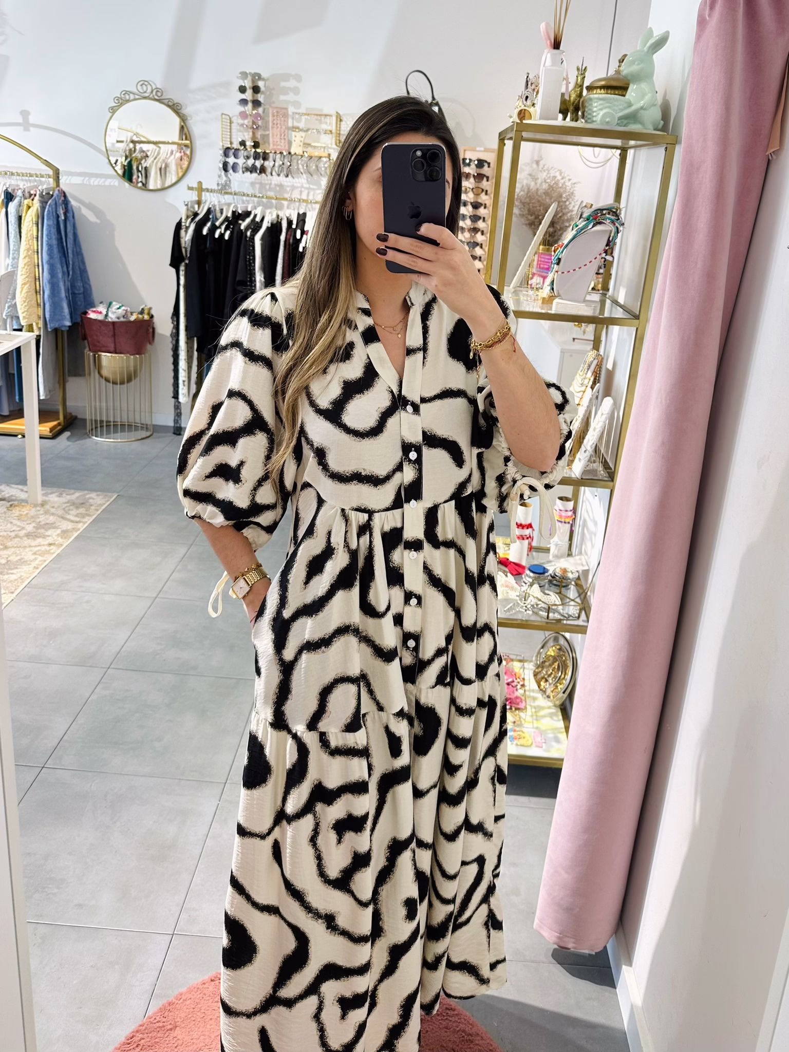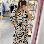 Vestido largo com mangas abalonada, aperta com botões na parte da frente.