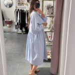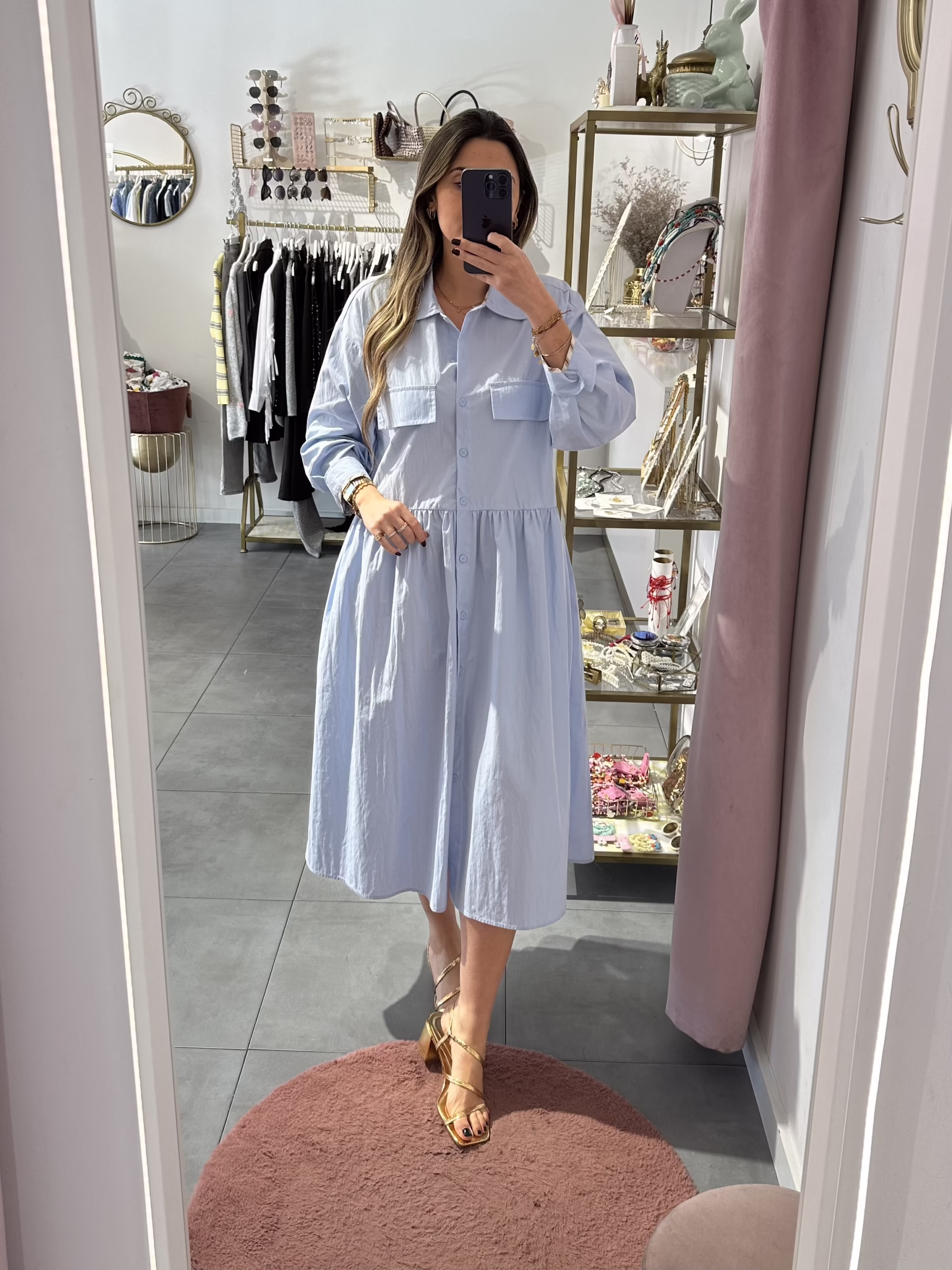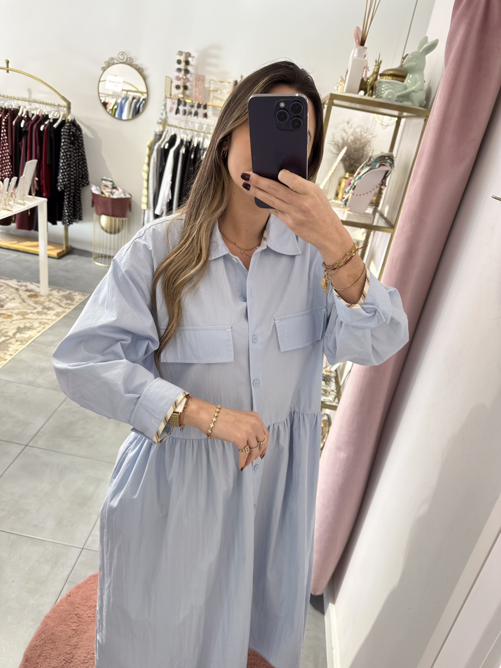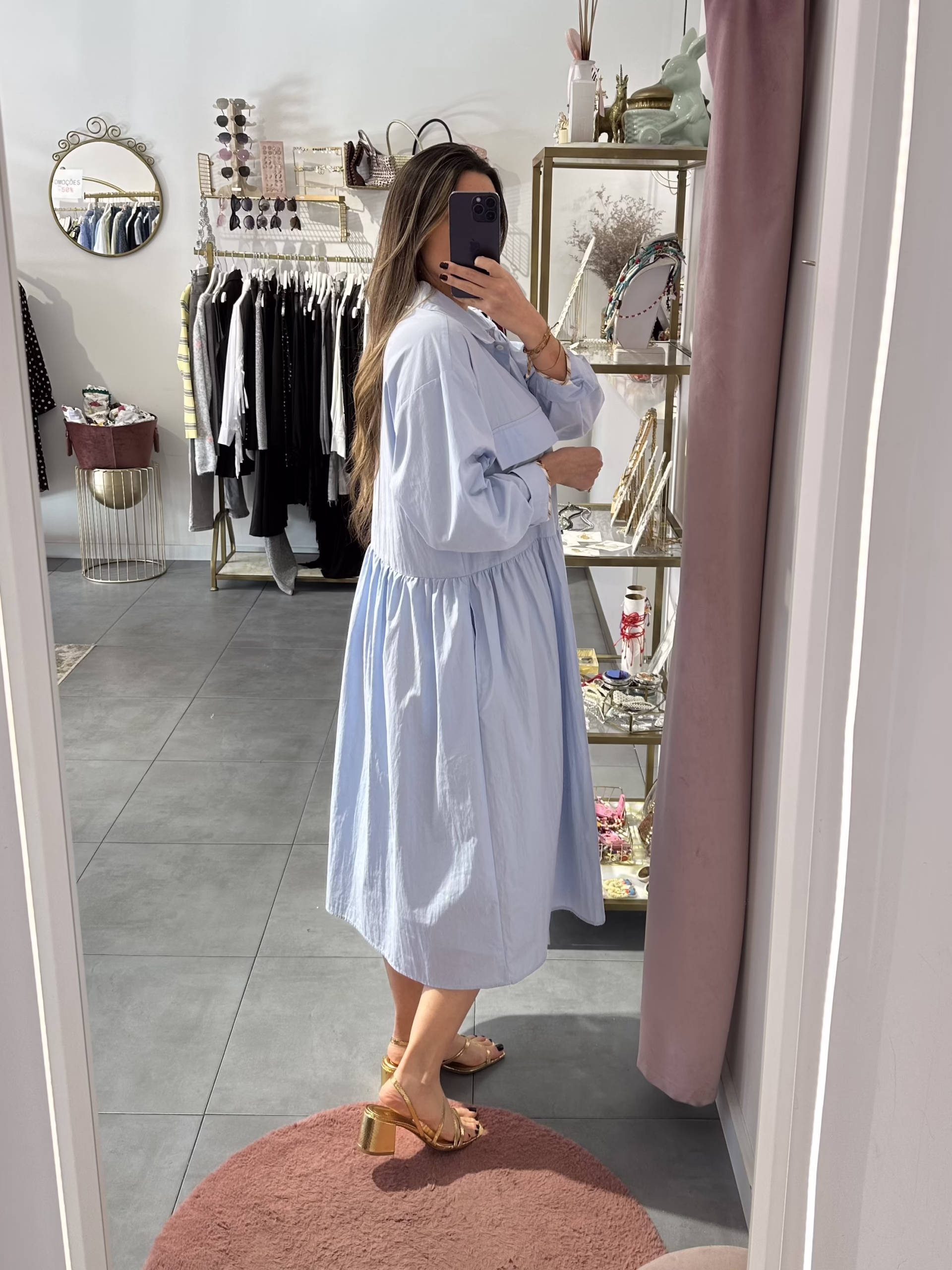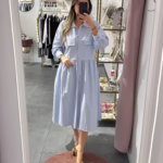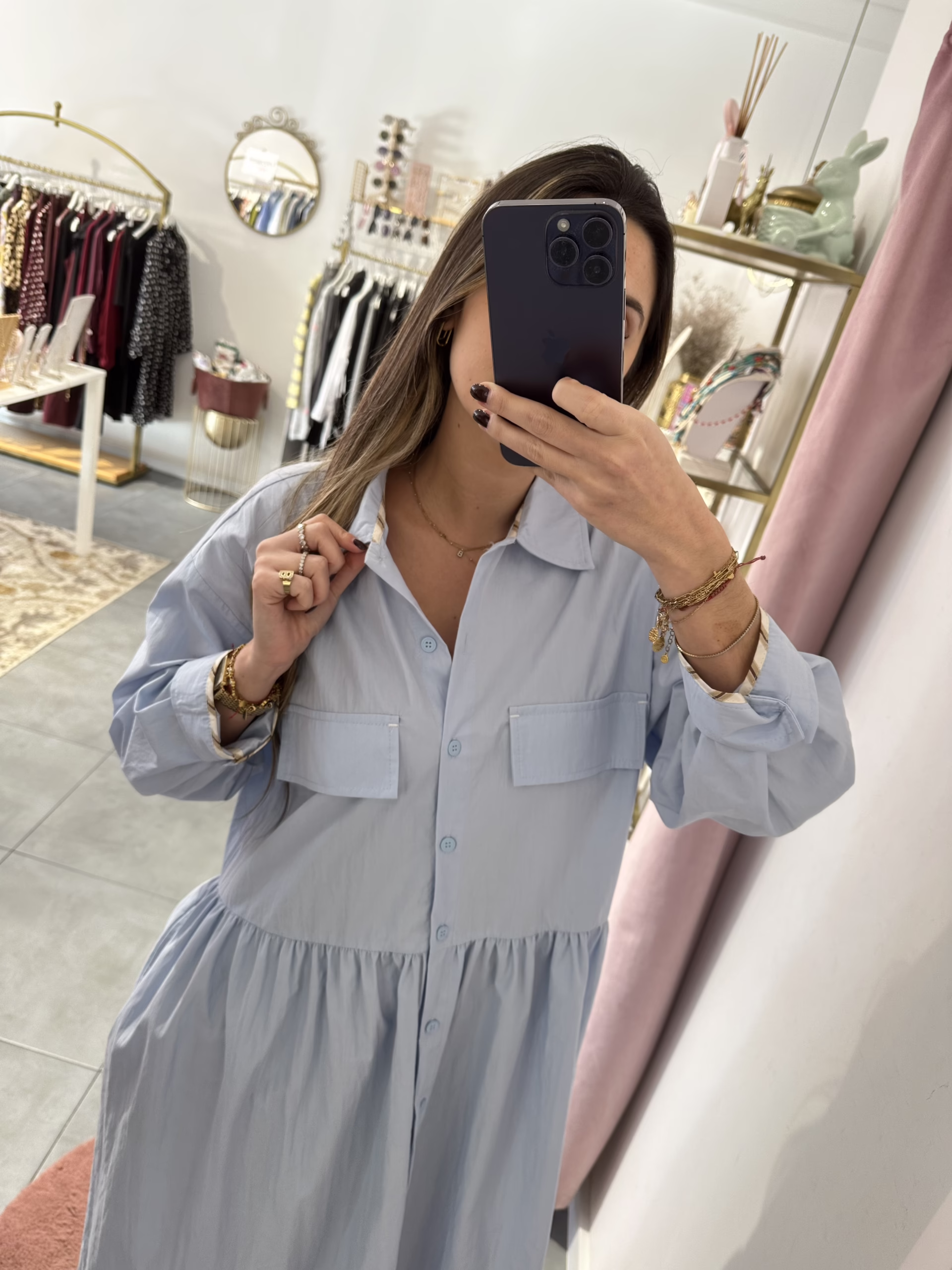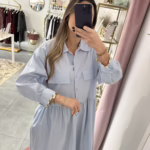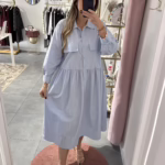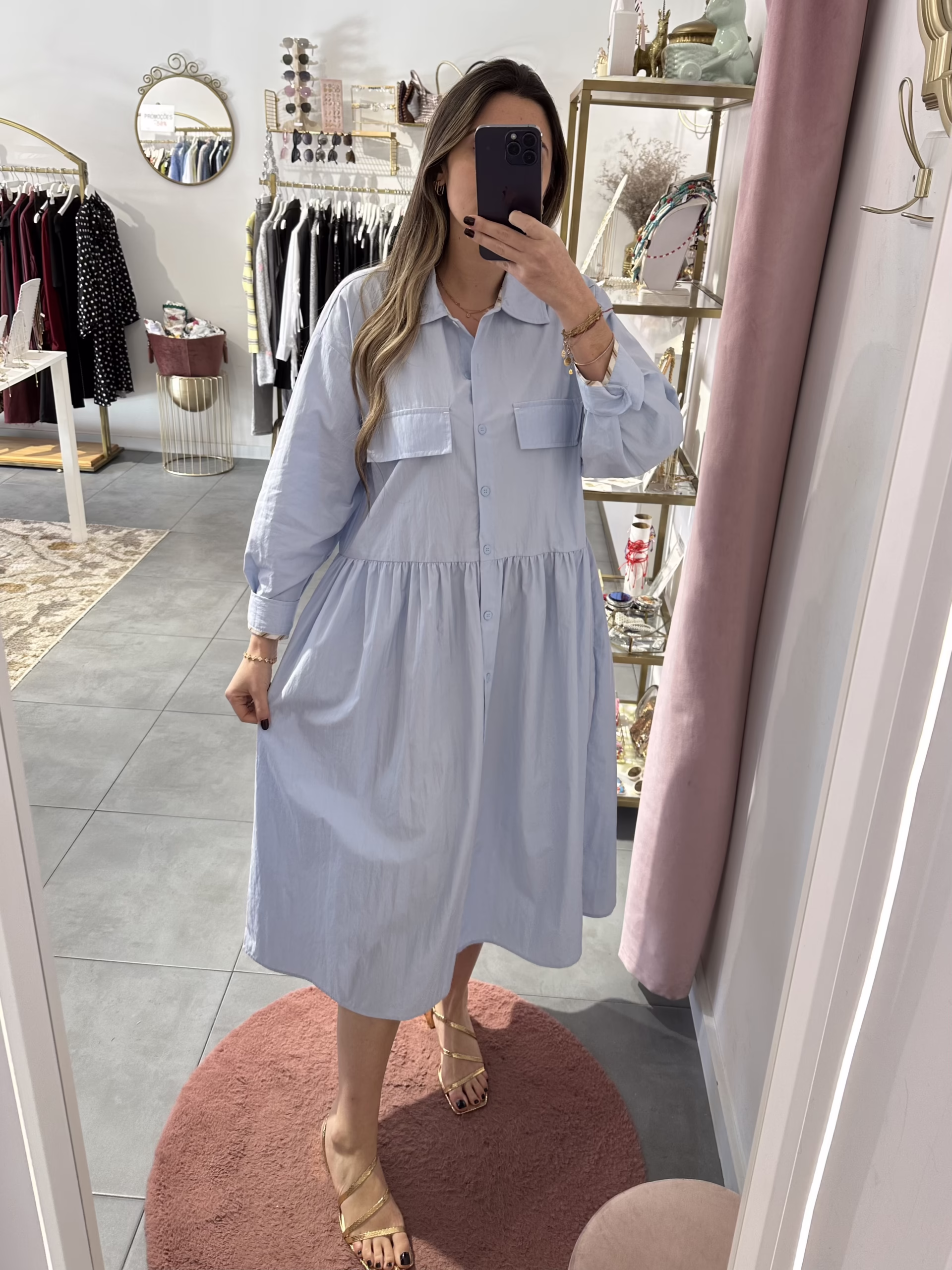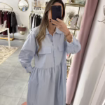 Vestido em tecido de camisa. Aperta com botões e tem bolsos.