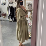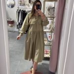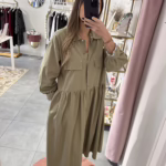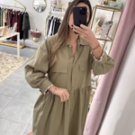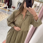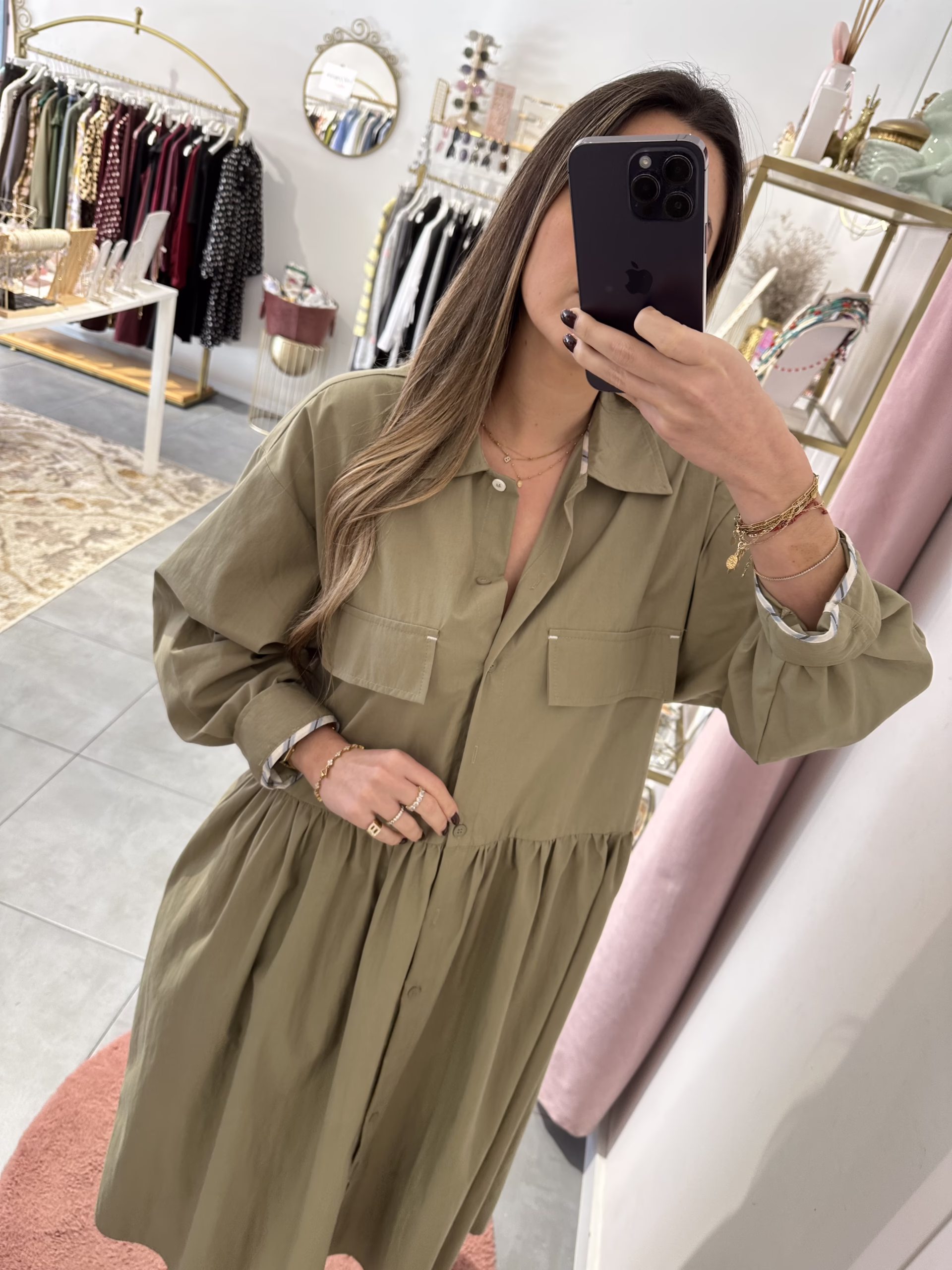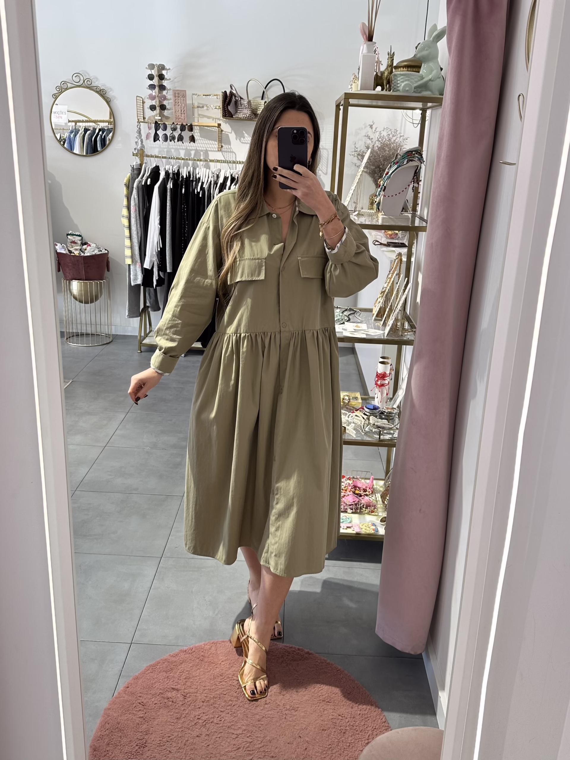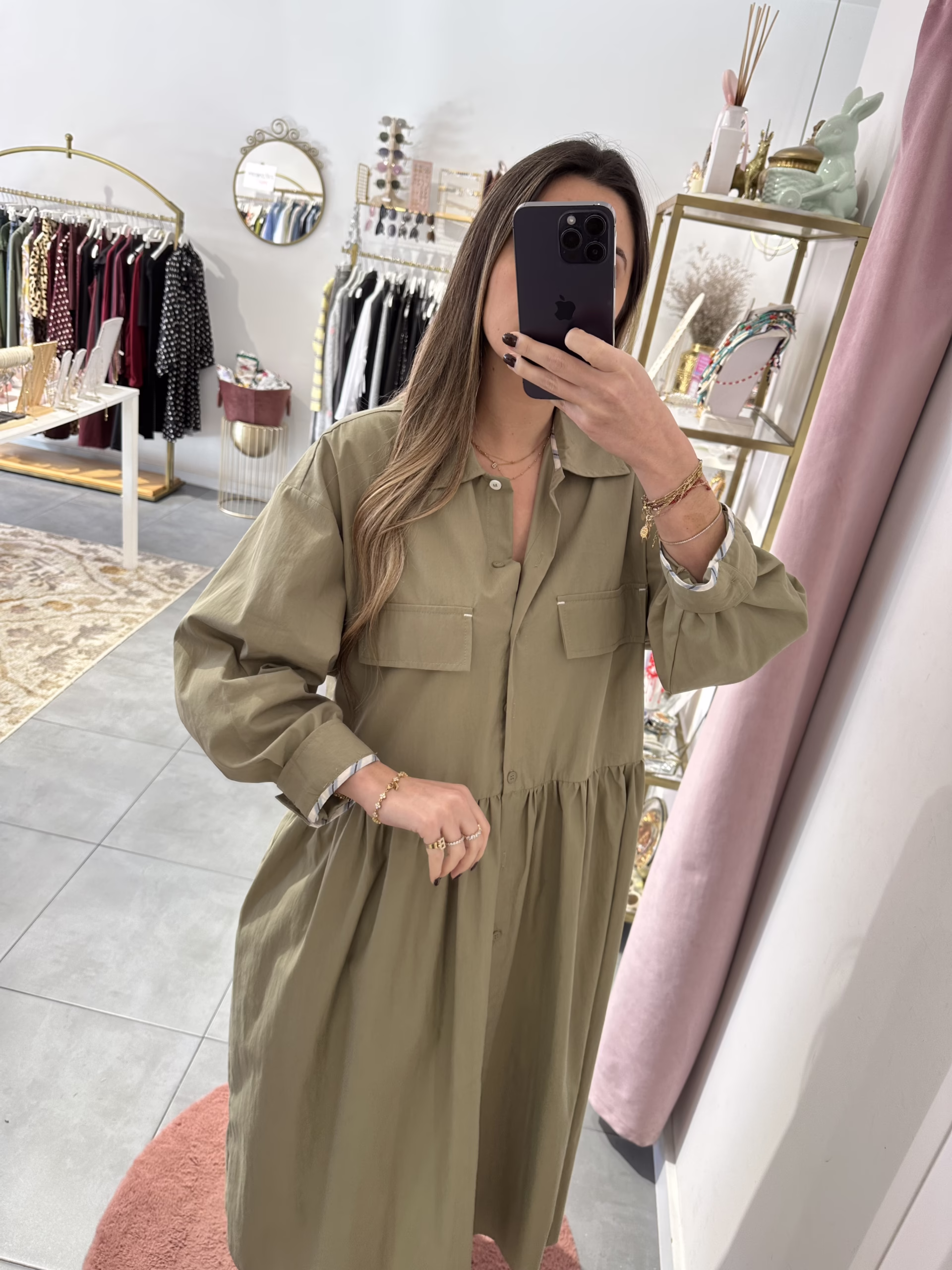 Vestido em tecido de camisa. Aperta com botões e tem bolsos.