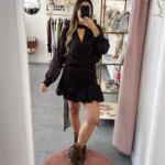 A modelo tem 1,73m e veste o tamanho M/L parte de cima e um 38/40 de parte de baixo.