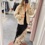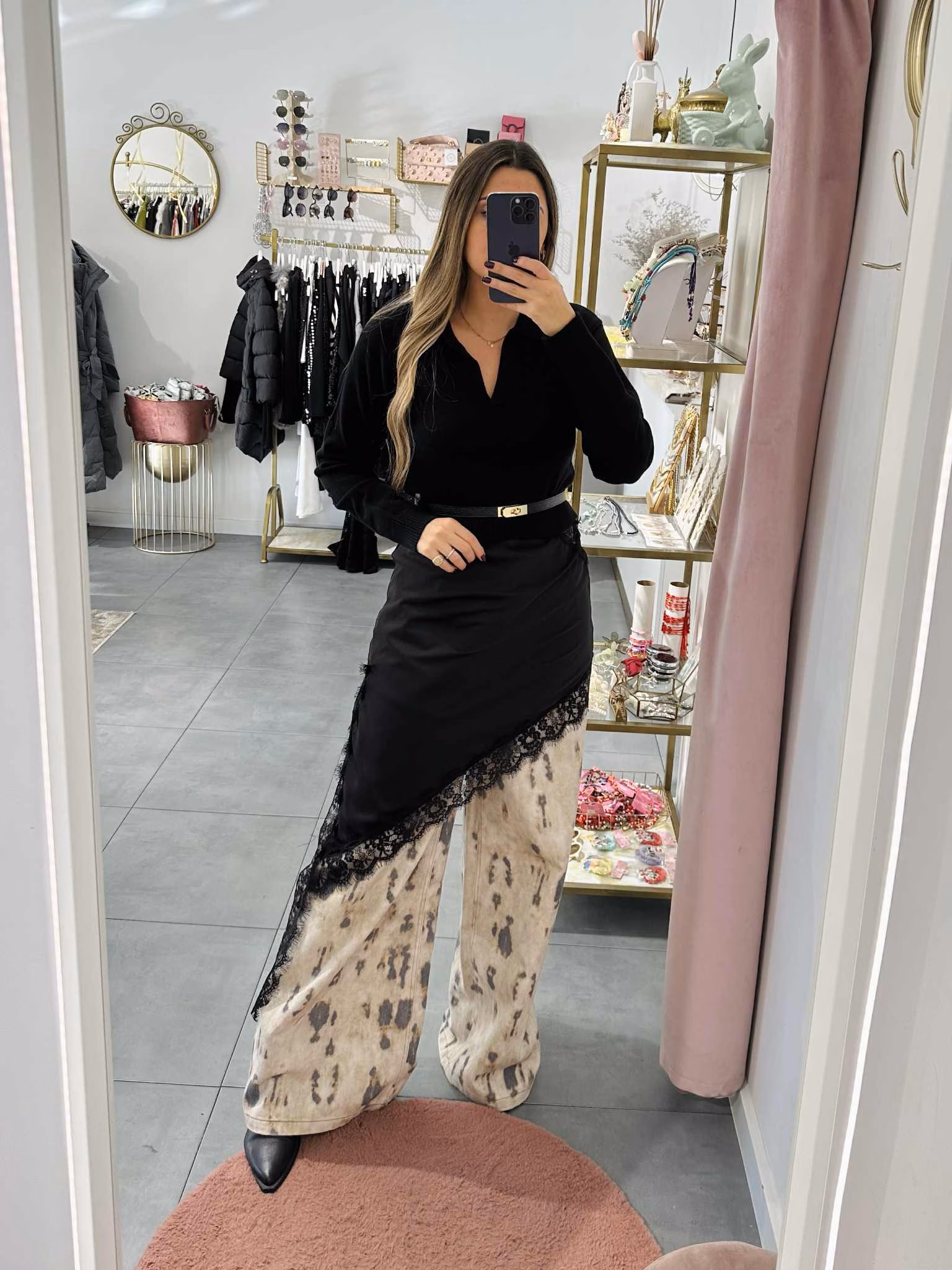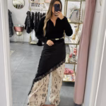A modelo tem 1,73m e veste o tamanho M/L parte de cima e um 38/40 de parte de baixo.