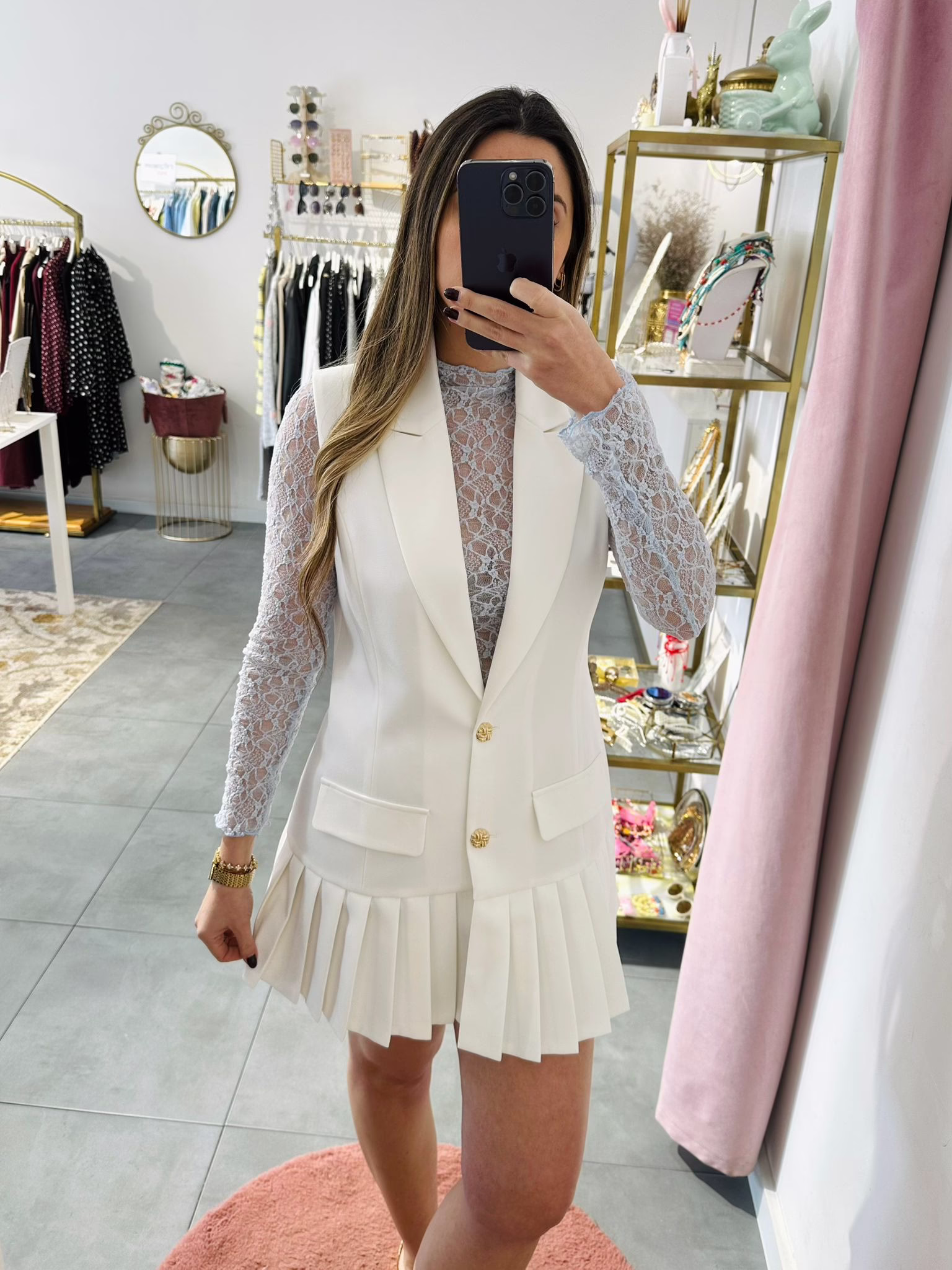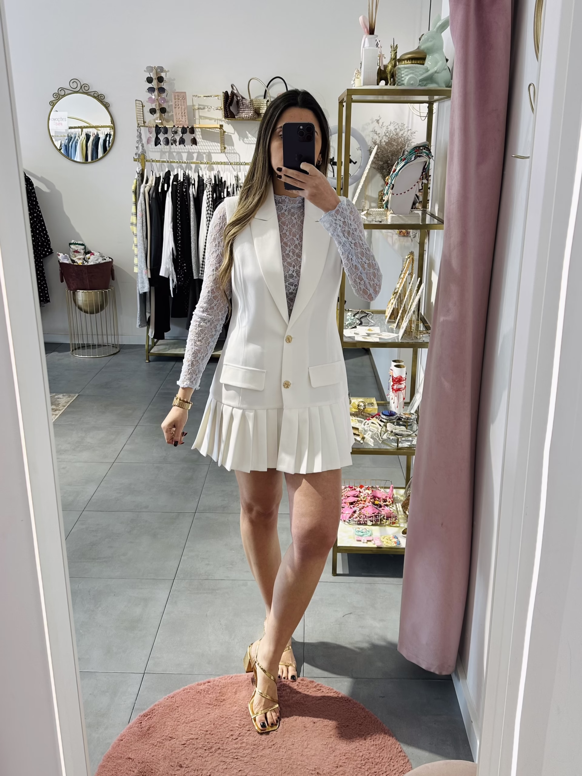 Vestido/colete com botões dourados.
