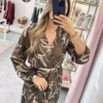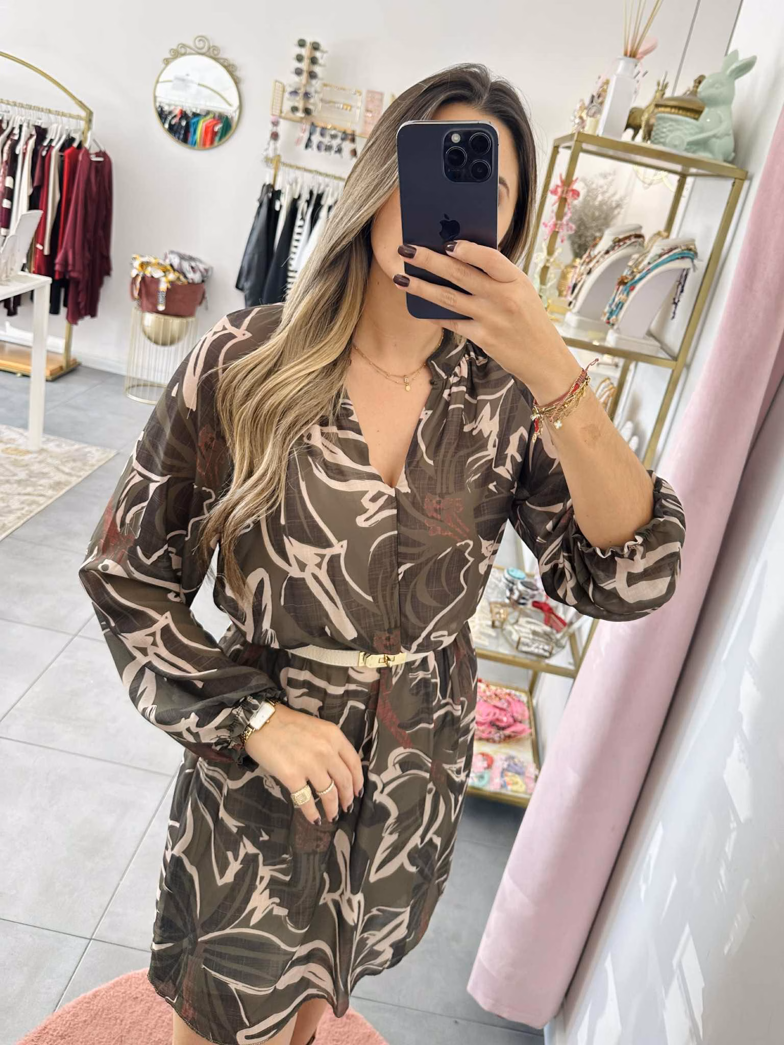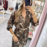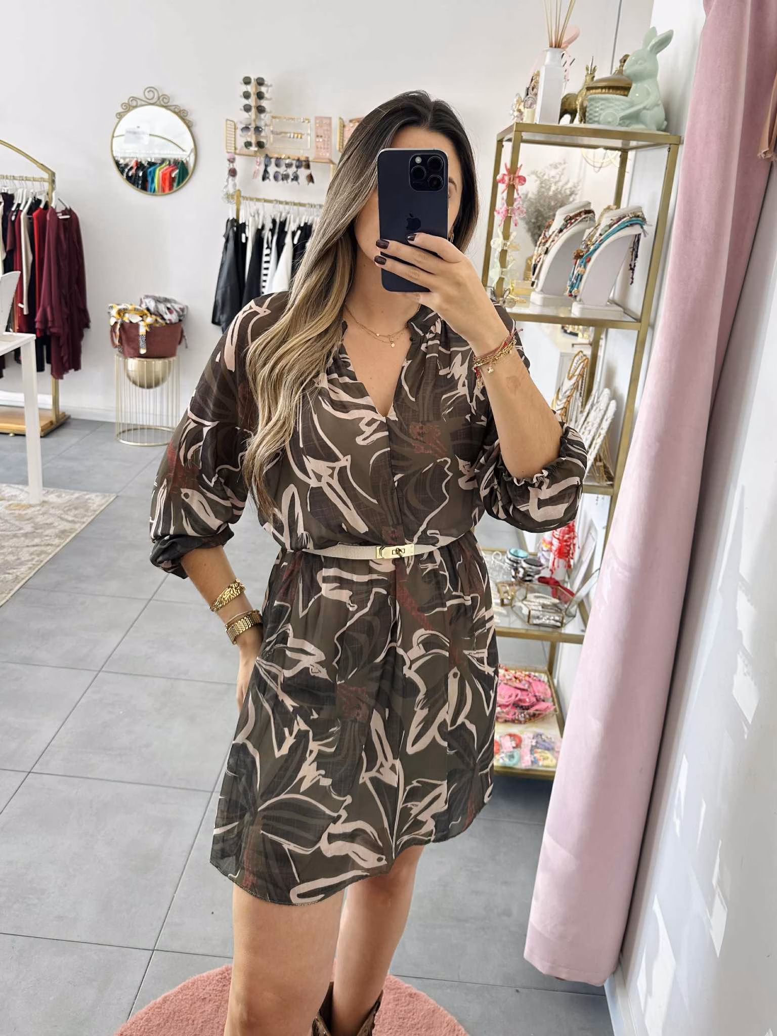 Vestido padrão verde, forrado. Tem elástico na cinta. O cinto não está incluído.