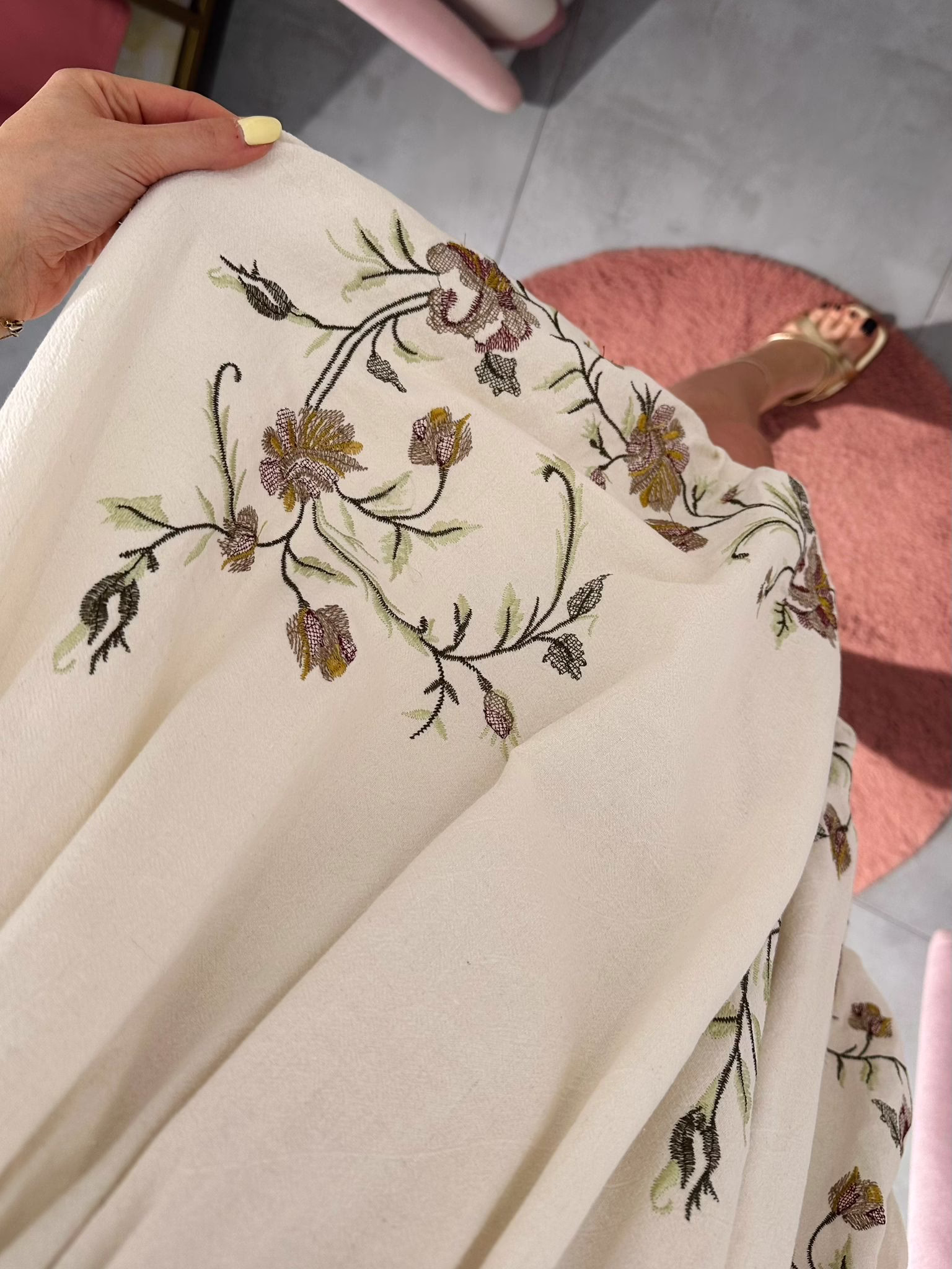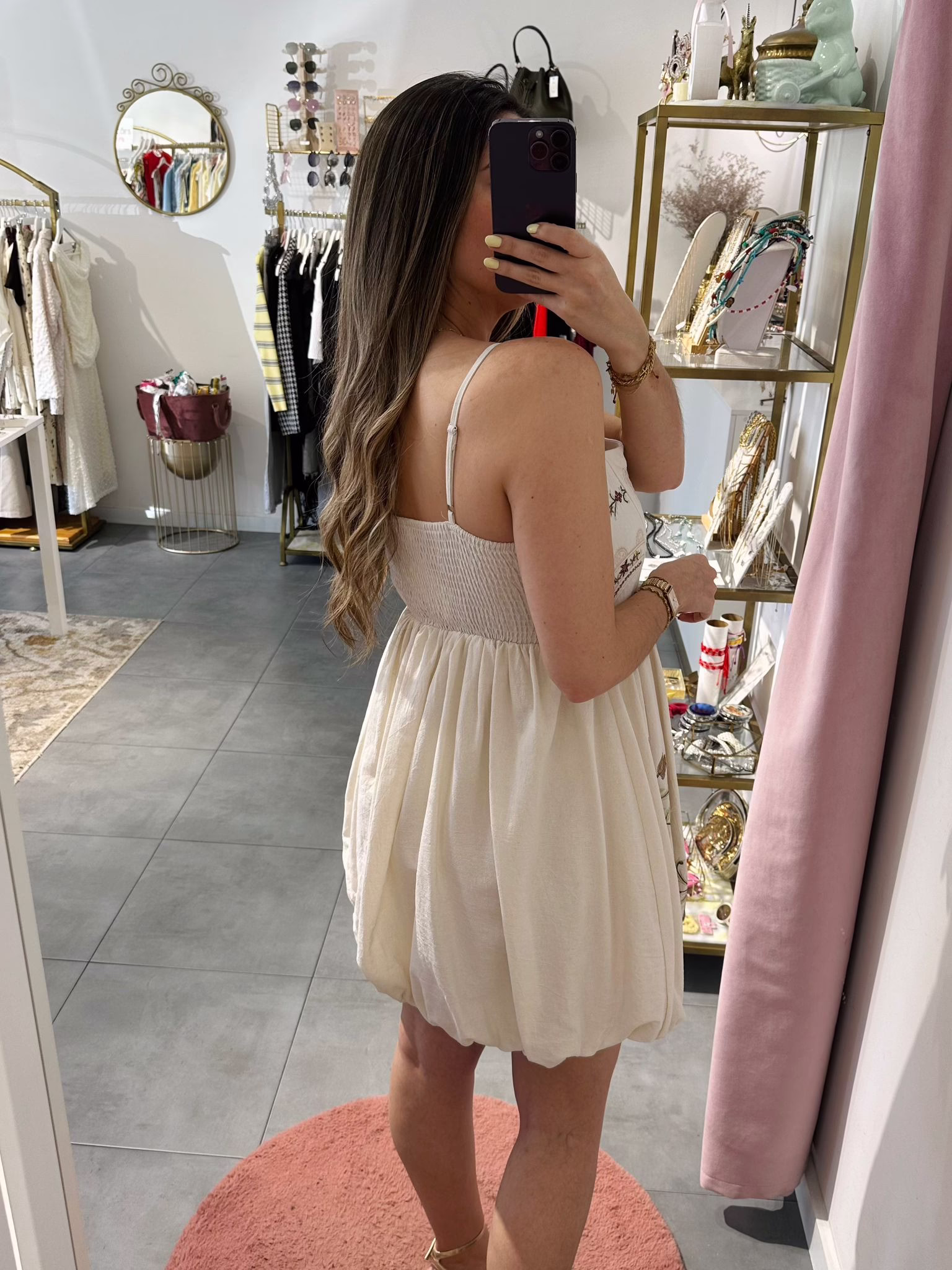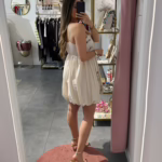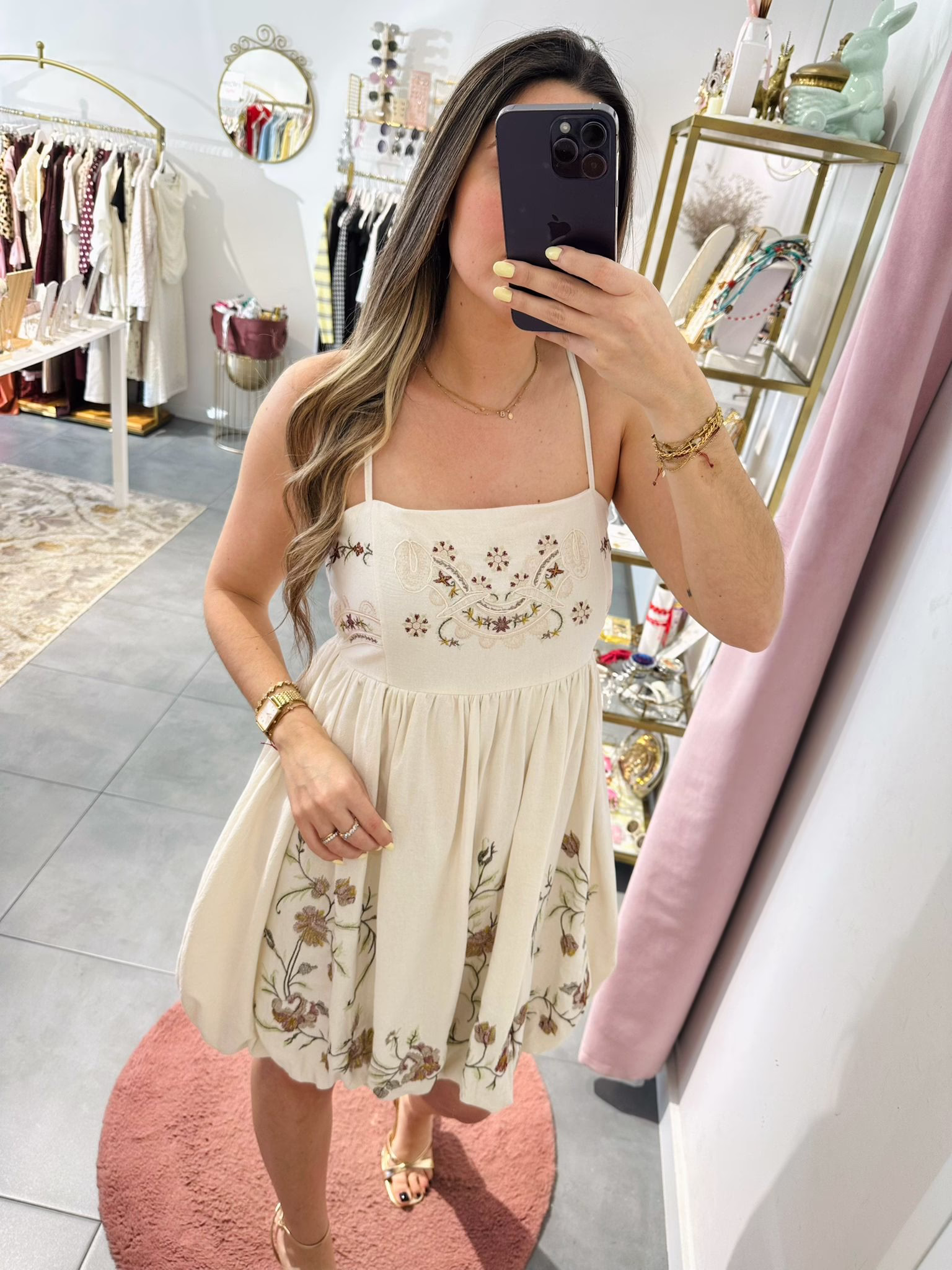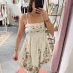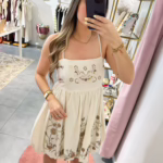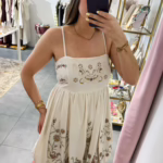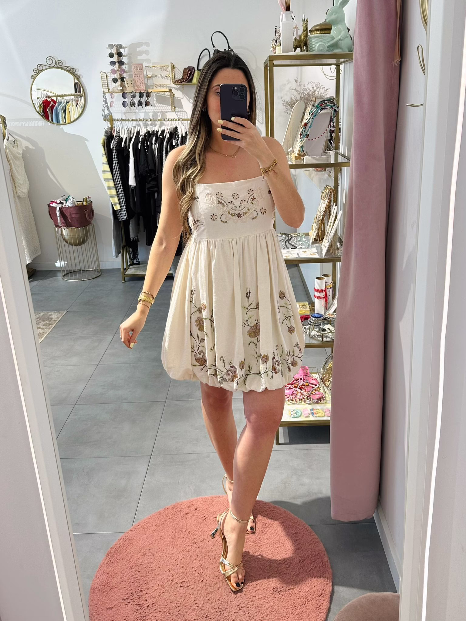 Vestido abalonado curto com vordados, as costas são elásticas e as alças são ajustáveis.