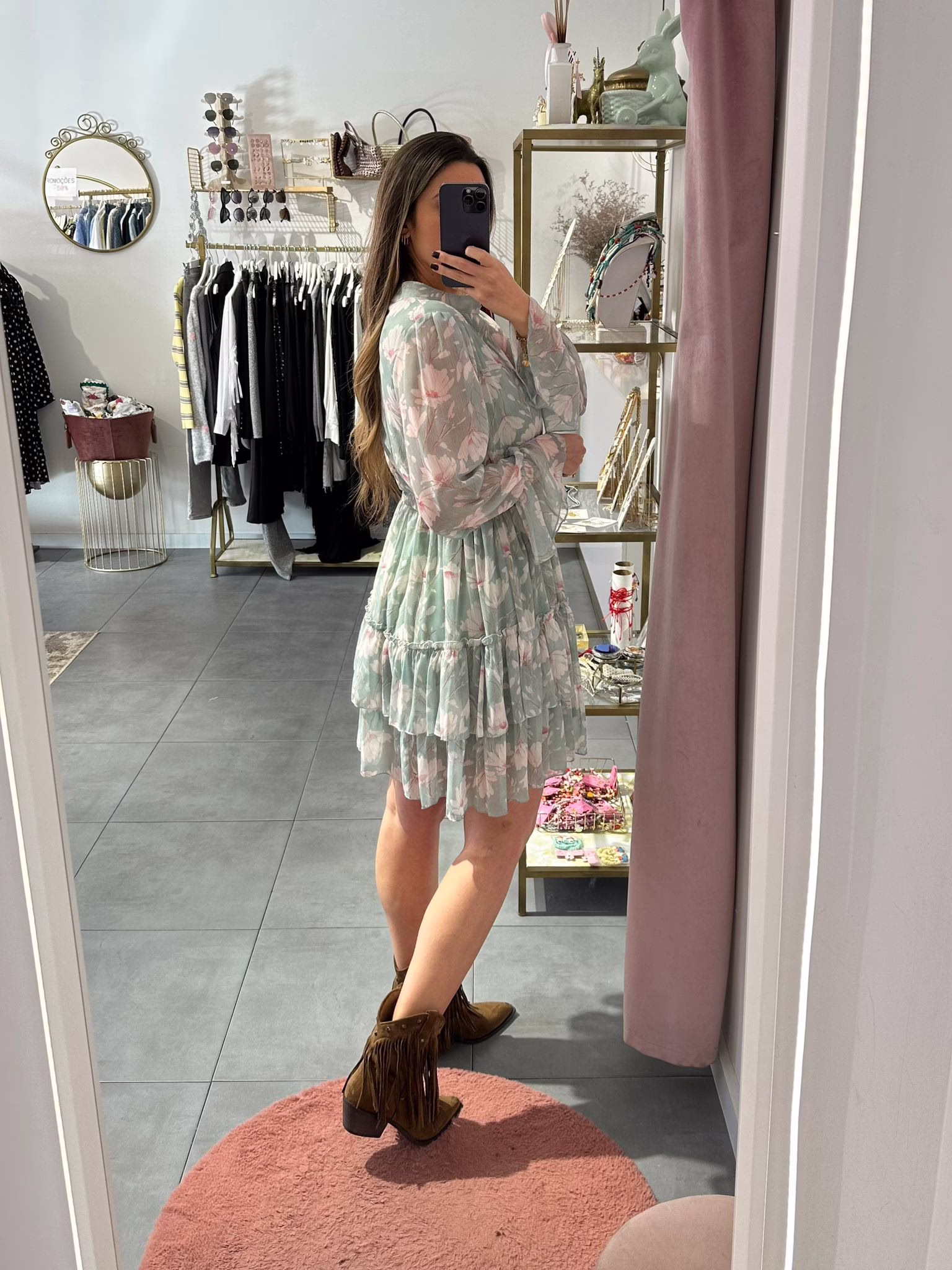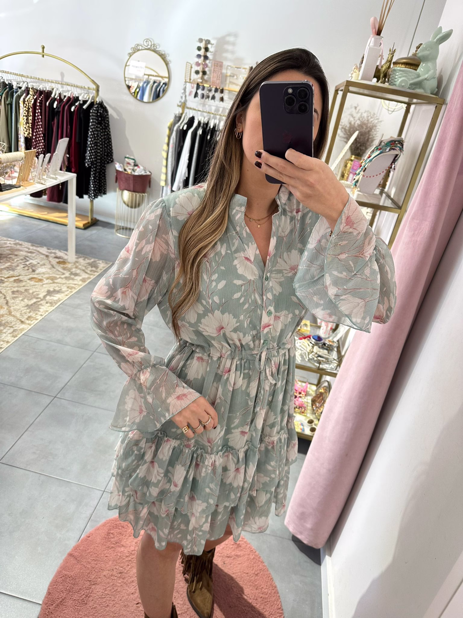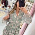 Vestido curto com padrão florido, é ajustável na zona da cintura e aperta com botões no peito.