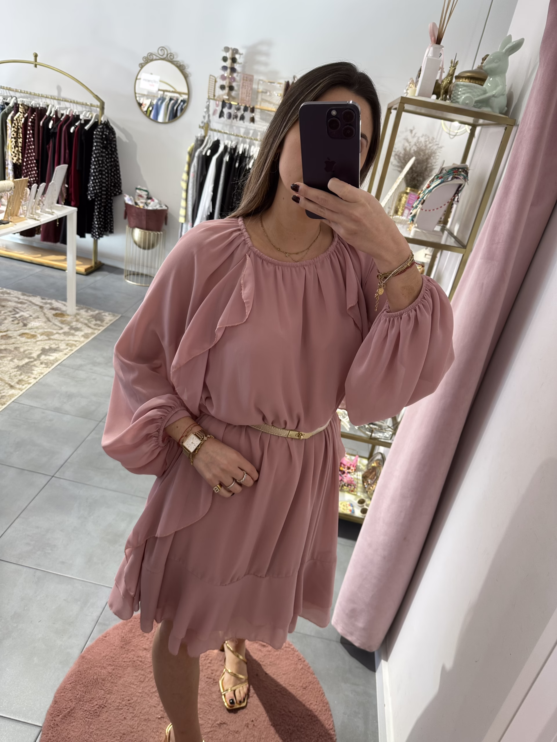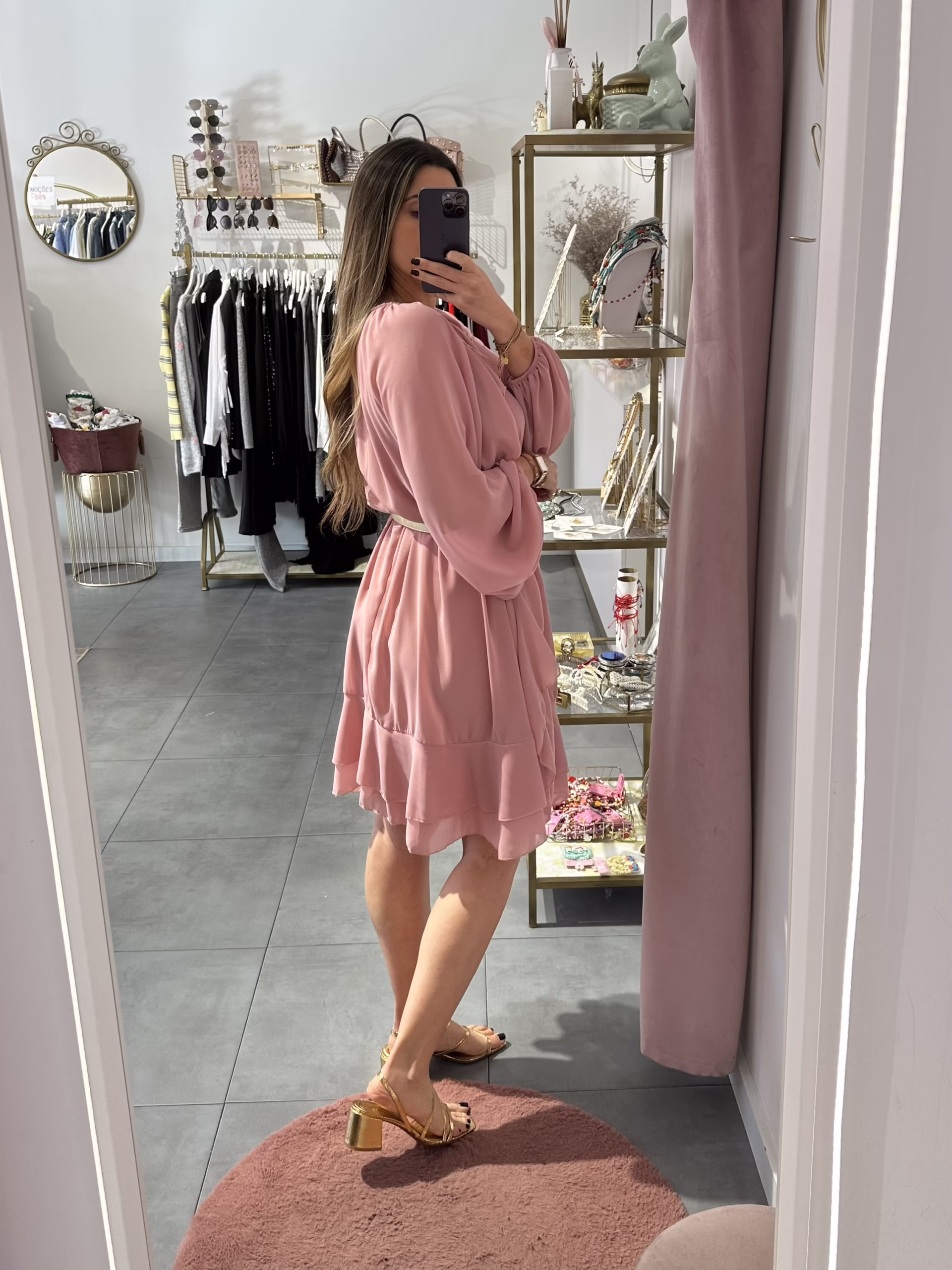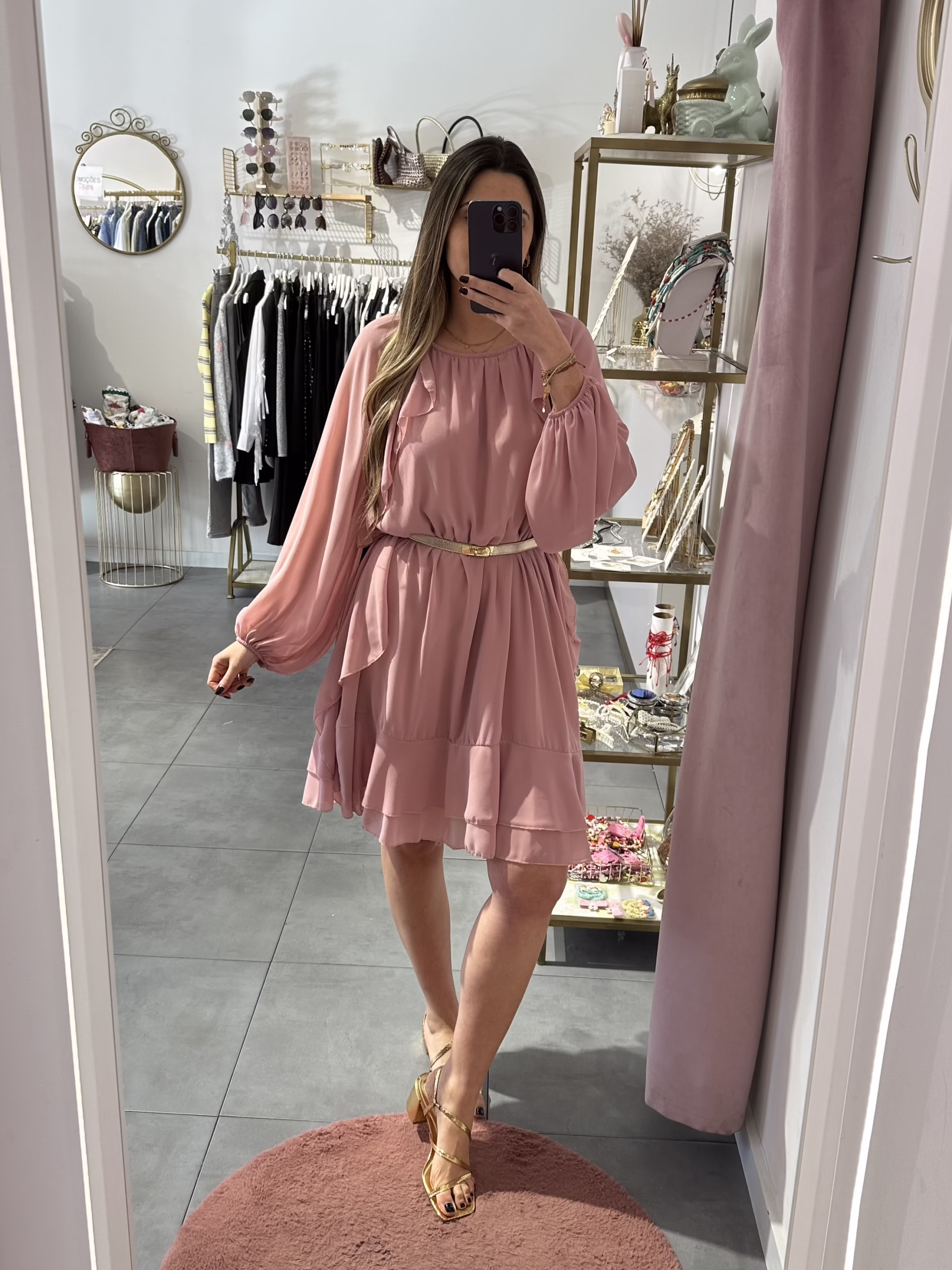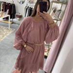 Vestido com folhos e manga abalonada, é forrado. O cinto não está incluído.