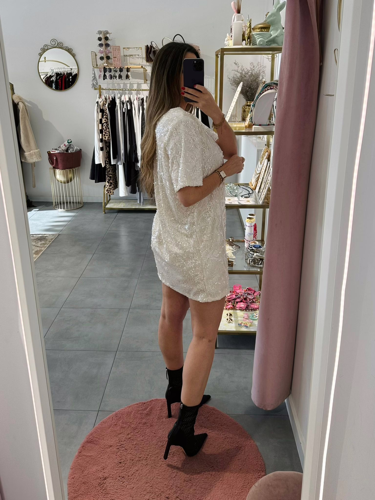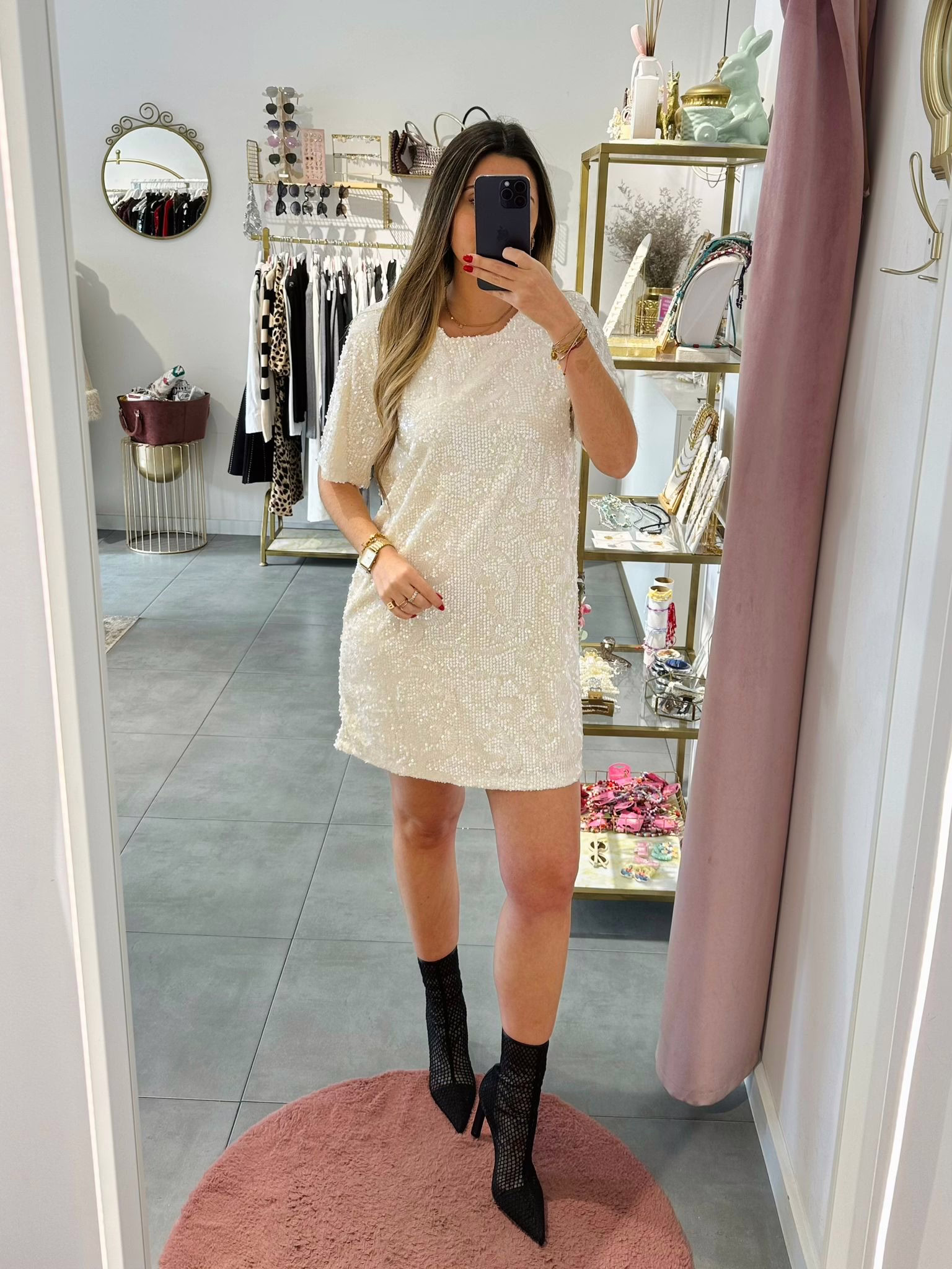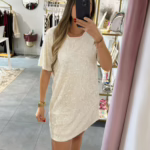 Vestido curto sem mangas, é em lantejoulas com veludo.