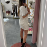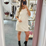 A modelo tem 1,73m e veste o tamanho M/L parte de cima e um 38/40 de parte de baixo.