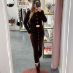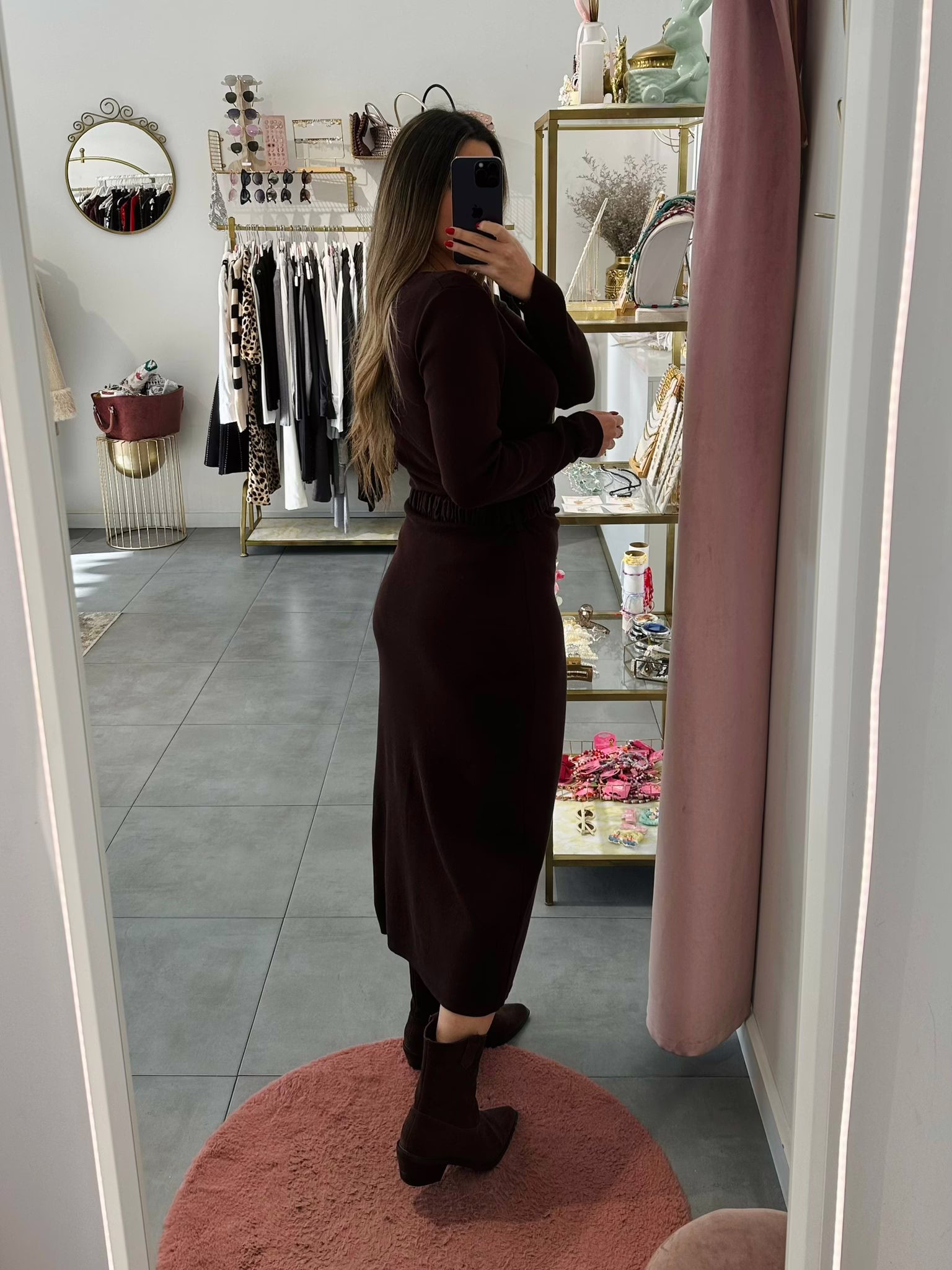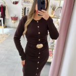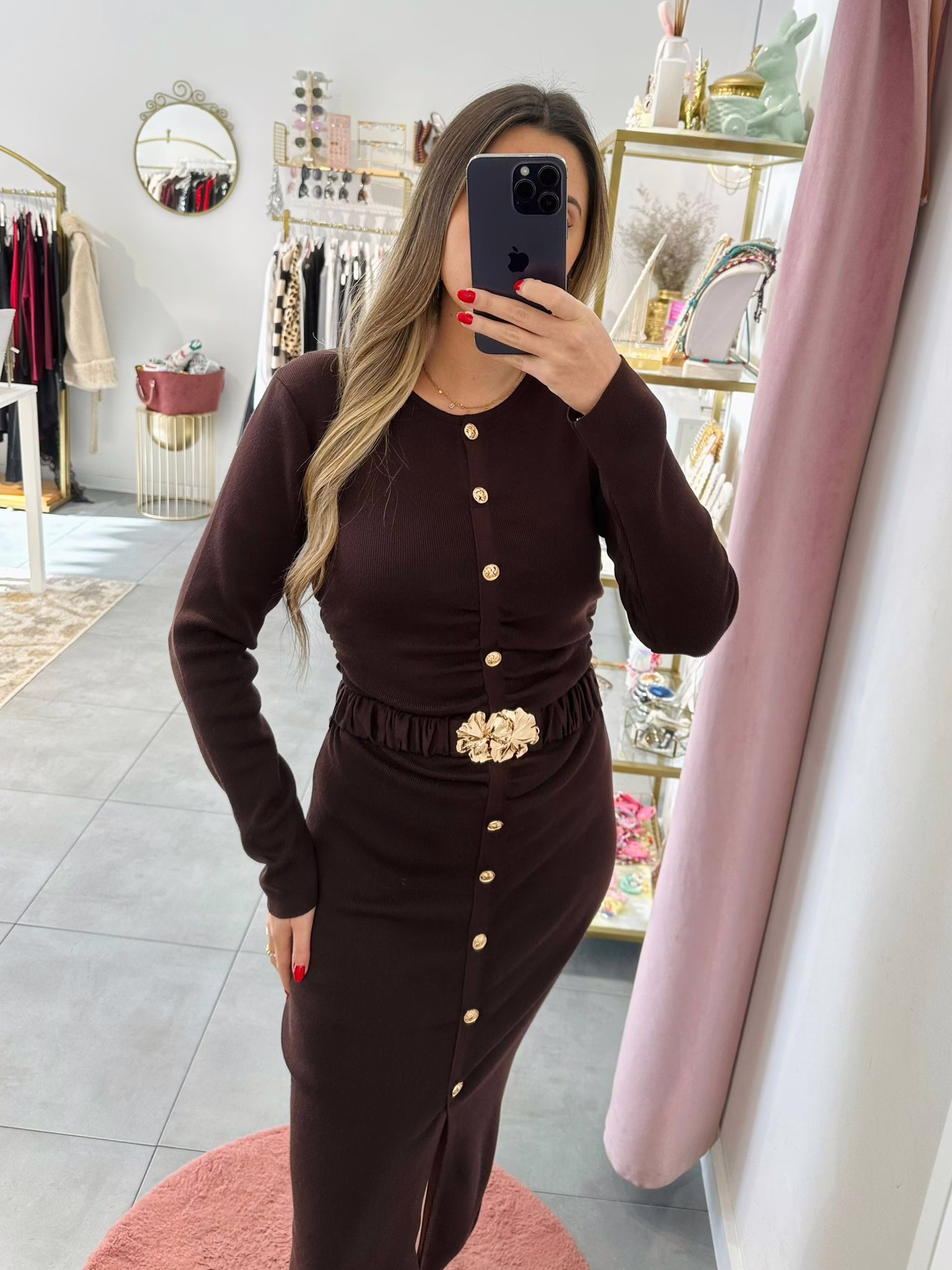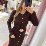 Vestido em malha fria midi, tem botões dourados e cinto com flor dourada.