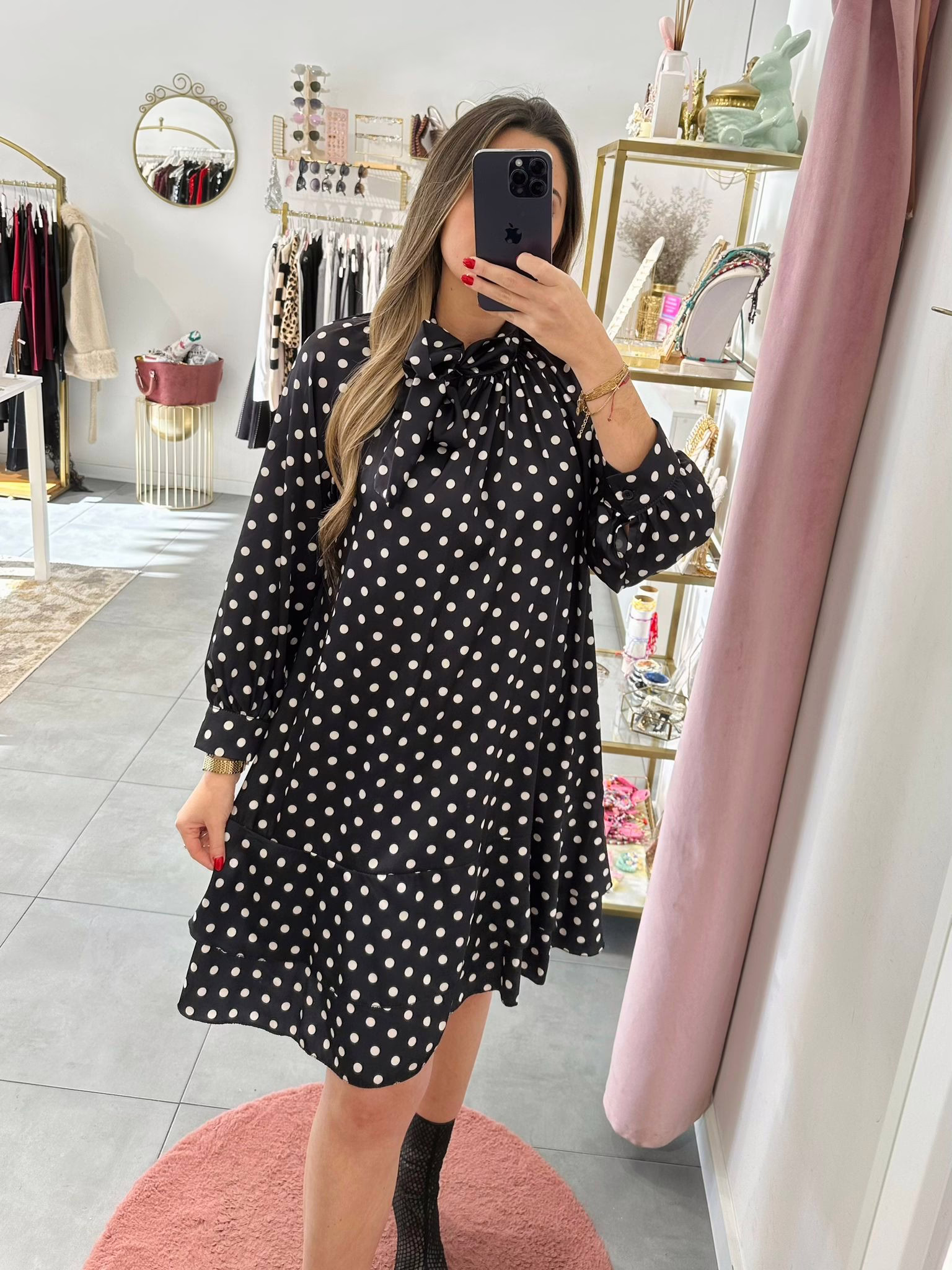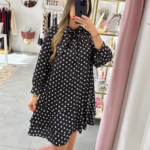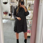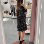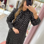Vestido preto acetinado com bolinhas bege.