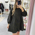 Vestido em tecido encorporado, aperta com botão no pescoço.